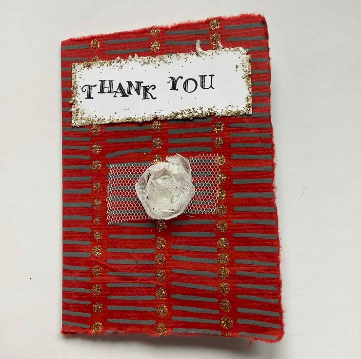 Card 2 has a red, grey and gold paper which has been torn for a softer finish. THANK YOU has been stamped on with the black ink with a hint of gold shimmer.