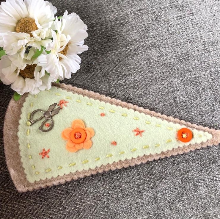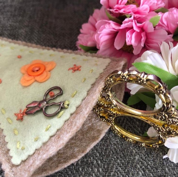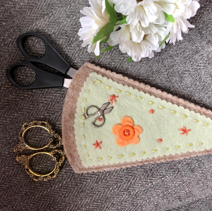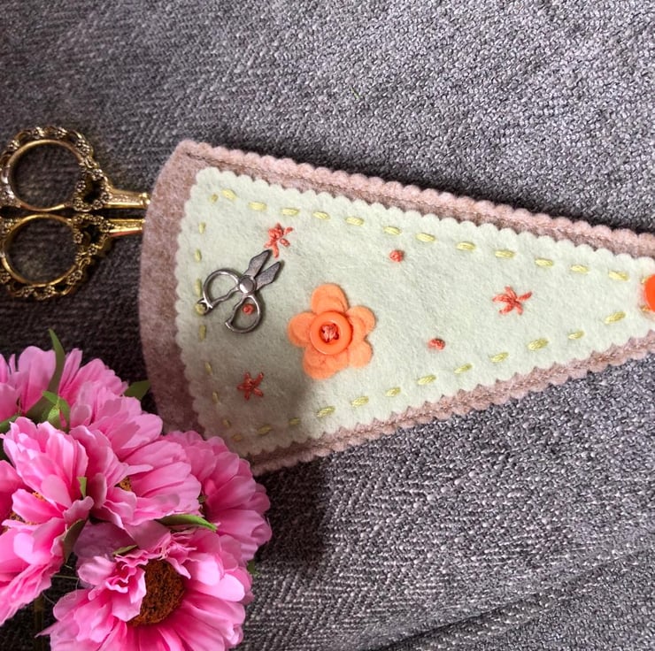 This hand embroidered wool felt scissor case will accommodate scissors up to 6 inch long fully encased, or up to 8 inches with the handles exposed and will easily hold 2 pairs.The scissor case has a scalloped edge and is overlayed with a contrasting, hand embroidered, wool felt topper, additionally decorated with buttons and a scissor charm.