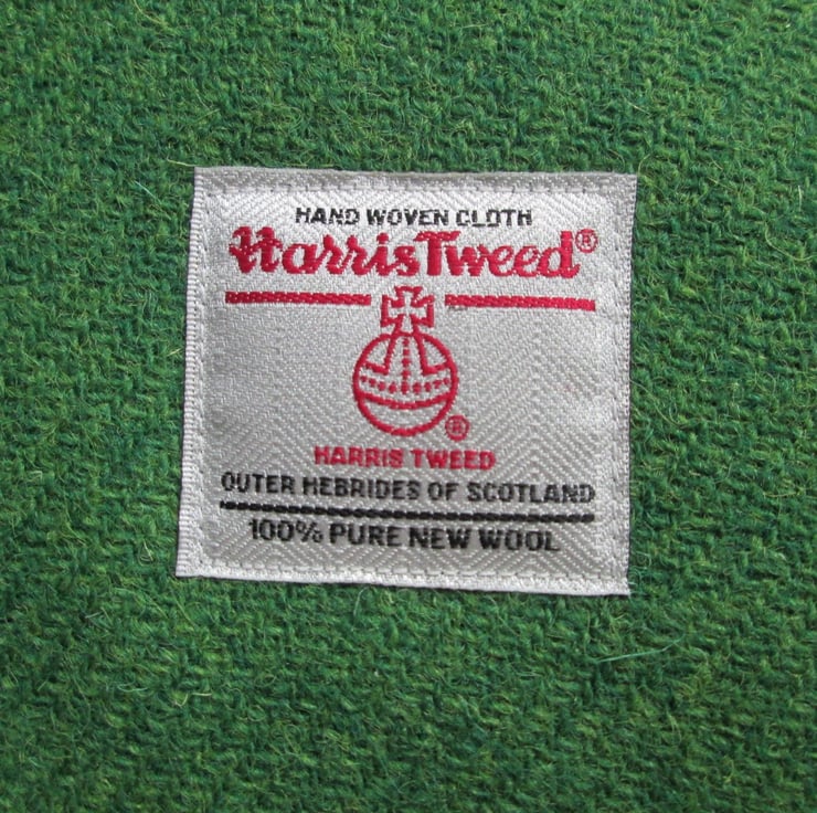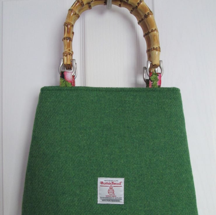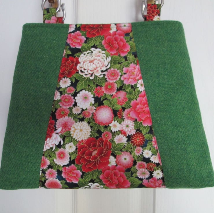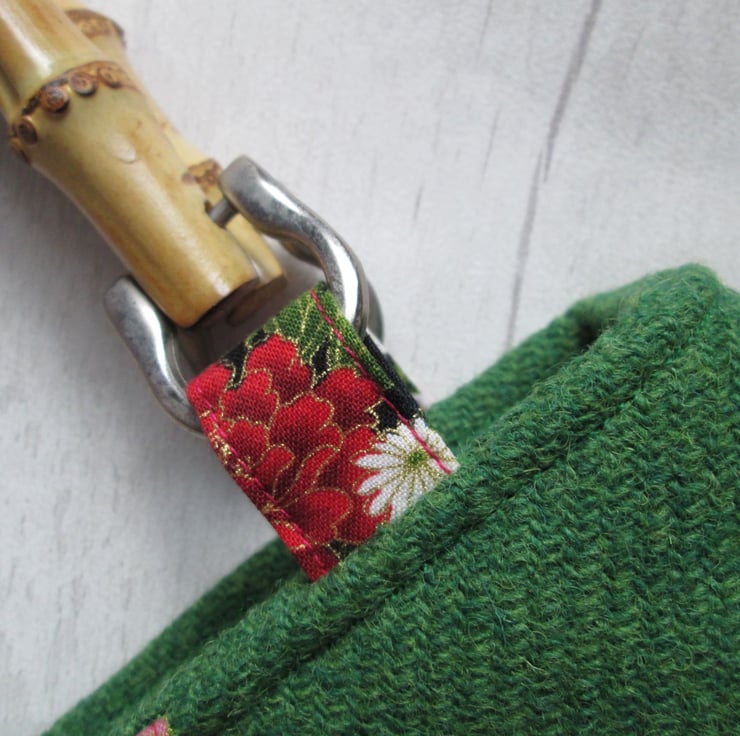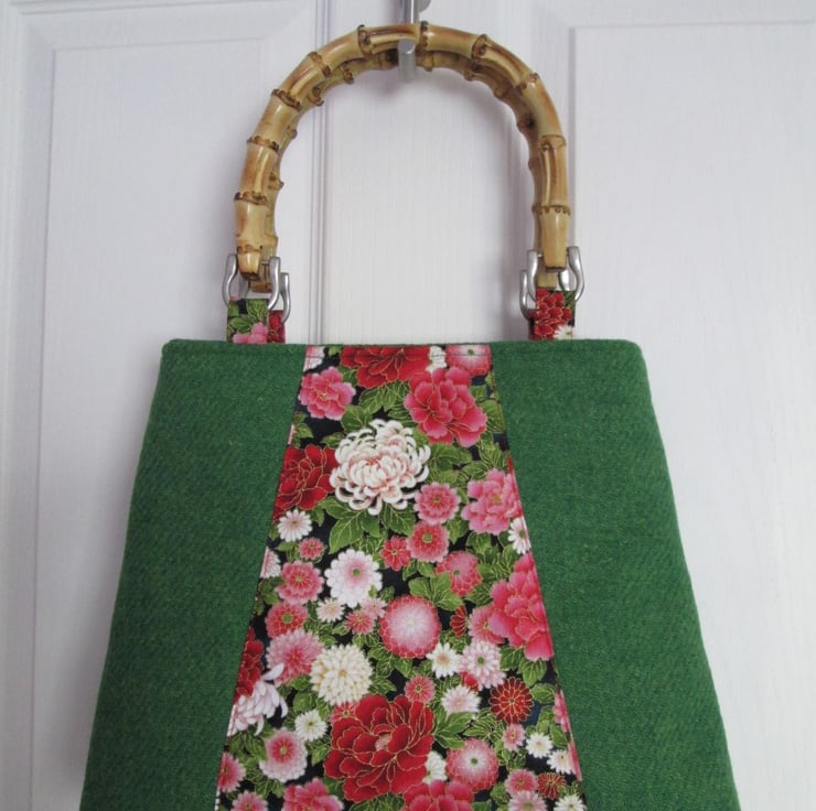 This is a 'one-of-a-kind' bag made from gorgeous, forest green 'Harris Tweed®' that was handwoven by Murdo Macleod (Isle of Harris Tweed). The rich green is the perfect background for the Japanese style floral print I've used both as a feature panel and for the loops which attach the bamboo handles. The back of the bag bears the 'Orb Mark' label which guarantees the authenticity of the 'Harris Tweed' - the only cloth in the world protected by its own Act of Parliament..