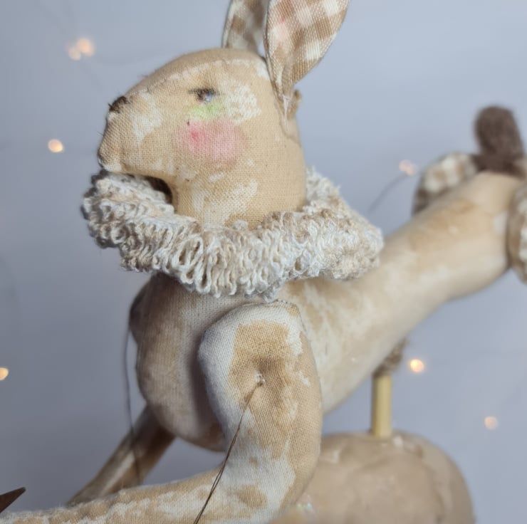Hare is leaping with his best Elizabethian ruffle is stained to look aged and vintage, in his paw is a rusty tin star freshly plucked from the heaens.