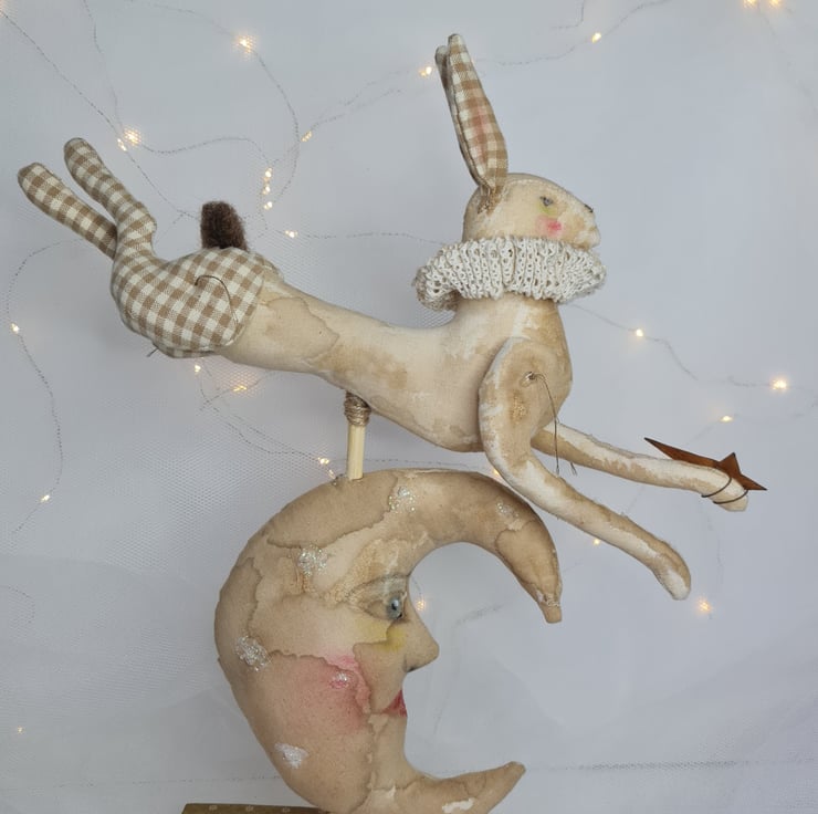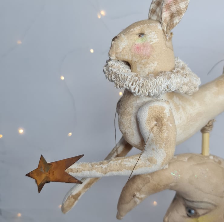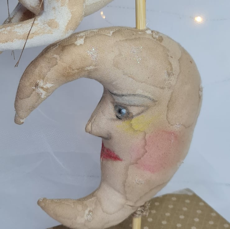 Moon is stained and painted in a vintage style dusted with sparkles and embroidered with white cotton.