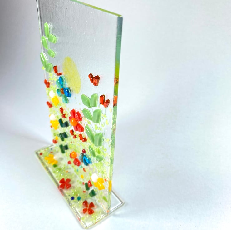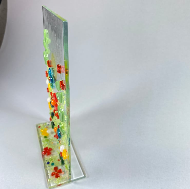Gorgeous free standing fused glass art . The floral glass art is made with a complementary glass base and can stand anywhere you wish . Brimming with colour each piece measures 4 inch x6 inch approx . If your buying as a gift and would like me to post direct I always wrap in attractive wrapping and can include a hand written note