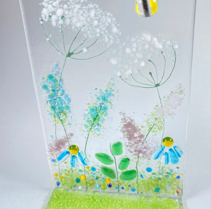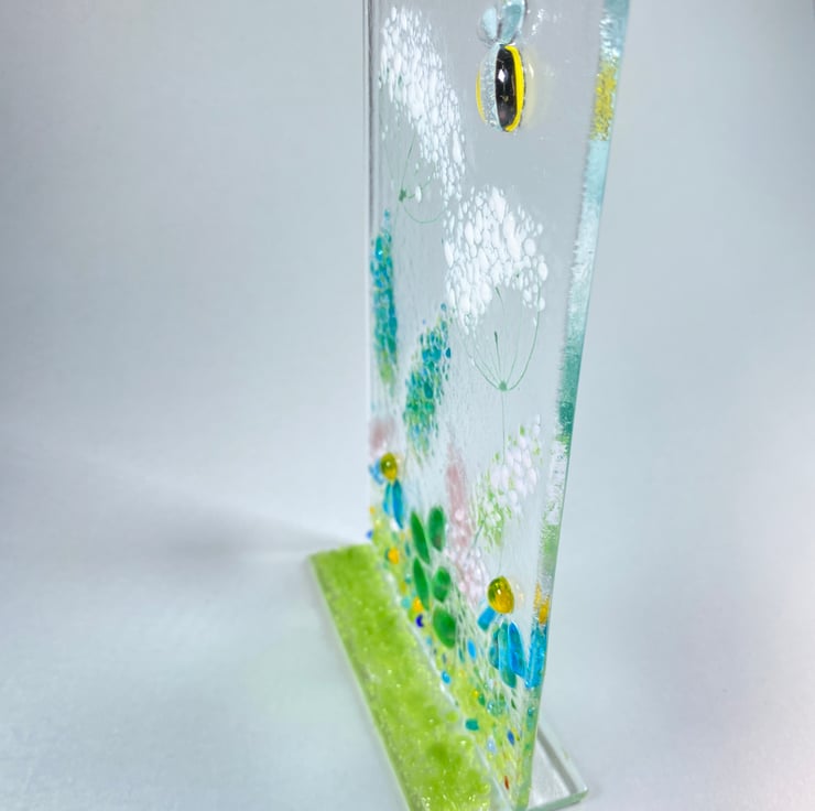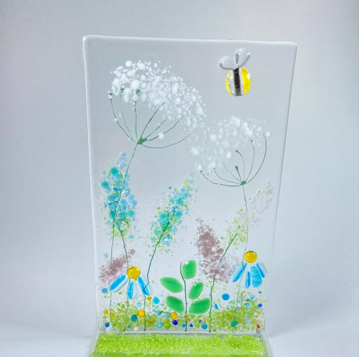 Gorgeous free standing fused glass art . The floral glass art is made with a complementary glass base and can stand anywhere you wish . Brimming with colour each piece measures 4 inch x6 inch approx . If your buying as a gift and would like me to post direct I always wrap in attractive wrapping and can include a hand written note