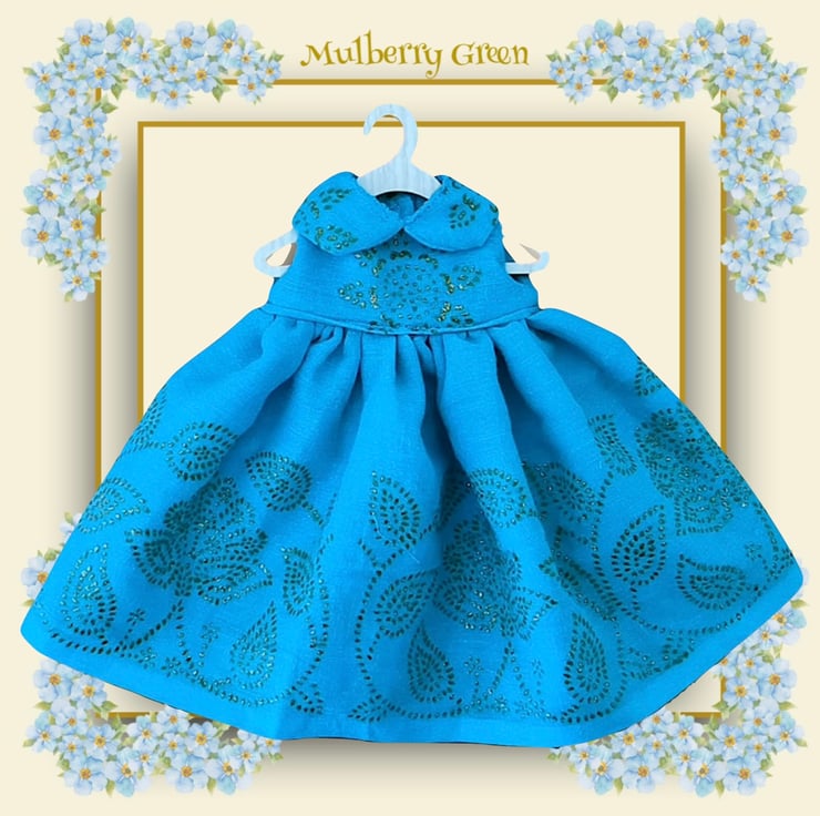 A beautiful dress in gold etched turquoise cotton, to fit the Mulberry Green characters. The dress has a double skirt in light cotton.