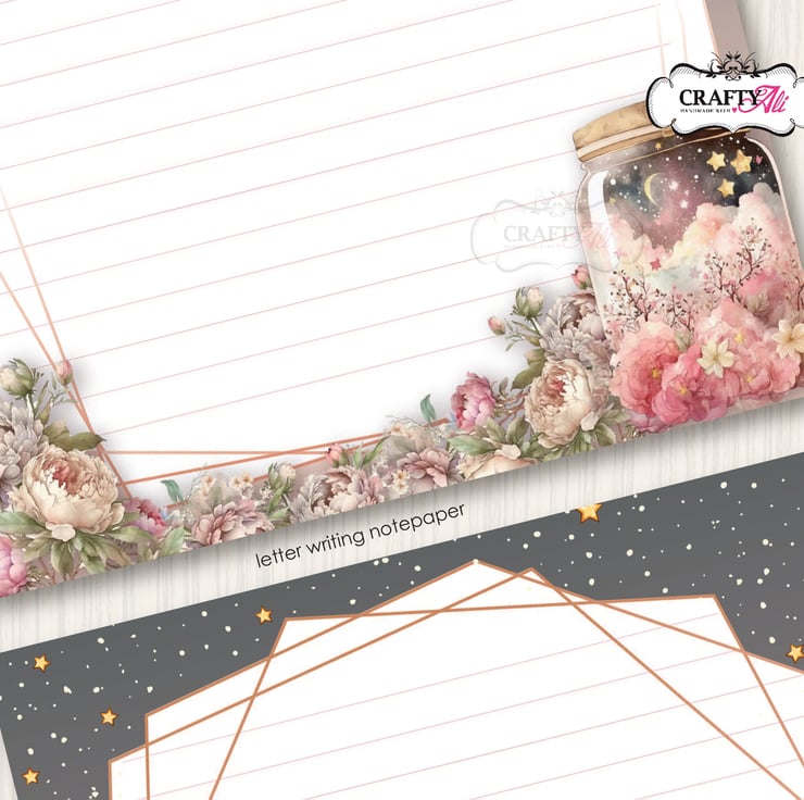 A set of 10 sheets of A5 size handmade letter writing / notepaper set with a pretty design featuring peonies and the night sky together with 5 x co-ordinating self-adhesive address labels.