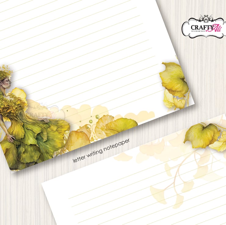 A set of 10 sheets of A5 size handmade letter writing / notepaper set with a pretty design featuring a fairy made of ginkgo leaves.