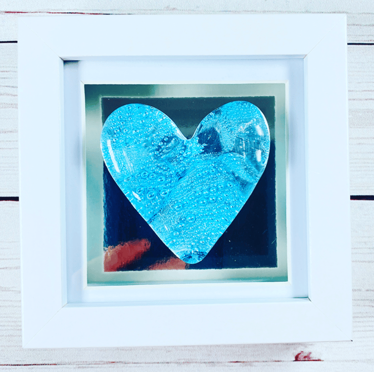 This fused glass heart is made using a chemical to react with the glass in the kiln to form these tiny blue bubbles . The heart is then fused again to get a silky smooth heart. The mirrored backing in the box framed picture helps to add light and reflects the heart . The 12 cm square box frame makes a lovely addition to your home and is easily hung on the wall or can free stand on a window sill or shelf . A lovely affordable gift idea too .