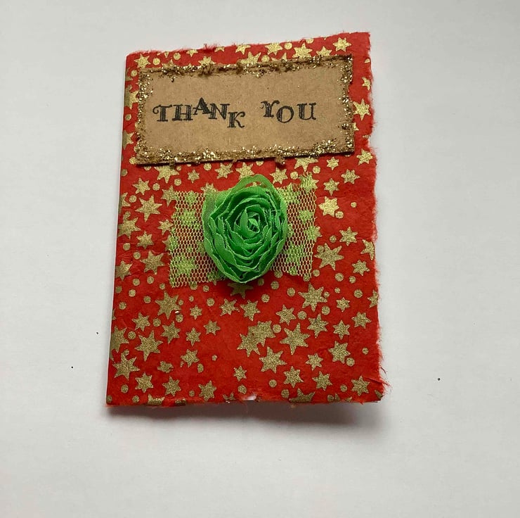 Card 1 has a red paper with gold stars which has been torn at the edges for a softer look. The word THANK YOU has been stamped in black ink with a hint of gold shimmer.