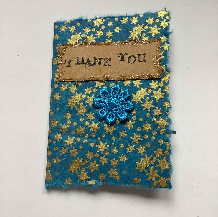 Card 3 has a blue paper with gold stars which has been torn for a softer finish. The word THANK YOU has been stamped in black ink with a hint of gold shimmer. A blue flower is fixed to the centre.