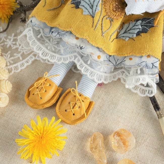 She is softly stuffed with chamomile in her stuffing for a gentle scent and she has a tiny citrine crystal at her heart for love. She has a brass ring to her back in case you want to place her on the wall.