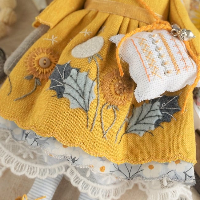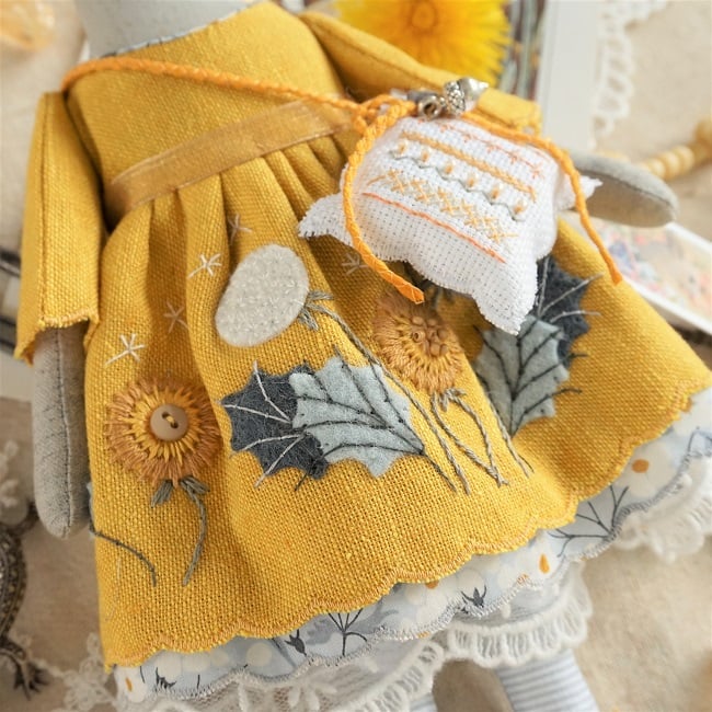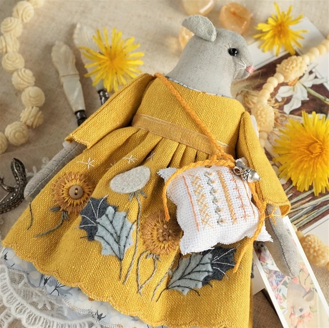 This is Dandelion, a tiny harvest mouse. She is a hand embroidered mouse with little leather ears and tail. She is dressed in an applique and embroidered dress with styalised dandelion flowers and leaves, reflecting the Mitsi Liberty Pattern of her underskirts. She has coordinating underskirts in Liberty Lawn with tulle lace and cotton lace bloomers. Her dress is finished with organza ribbon, tiny buttons and little leather shoes.