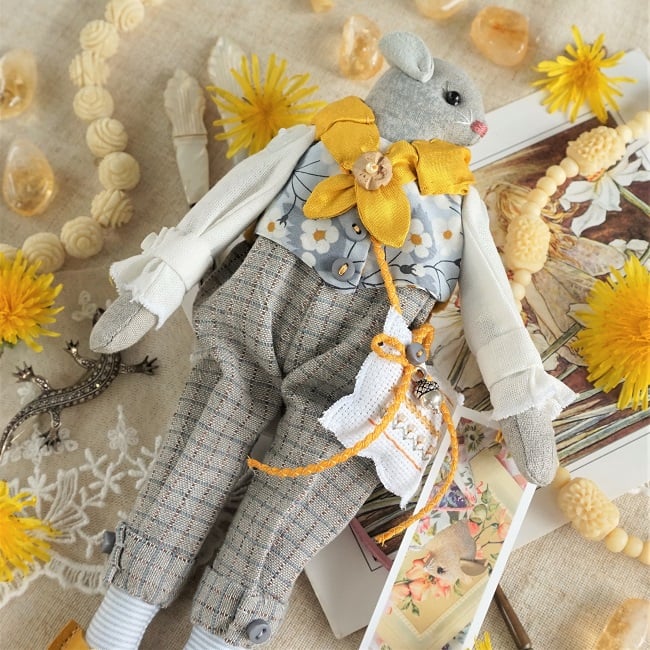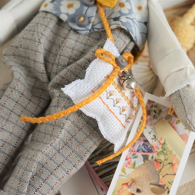 This is Gowan, a tiny grey mouse boy. He is a hand embroidered mouse with little leather ears and tail. He is dressed in tweedy yarn dyed cotton plus fours with linen shirt and Liberty print waistcoat called Mitsi Grey. He is finished with tiny buttons, leather shoes and a sampler on his little bag. He has a rich yellow silk scarf.