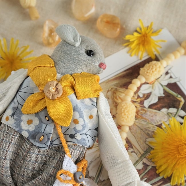 He is softly stuffed with Chamomile petals in his stuffing for a gentle scent and he has a tiny citrine crystal at his heart. He has a brass ring to his back in case you want to place him on the wall.