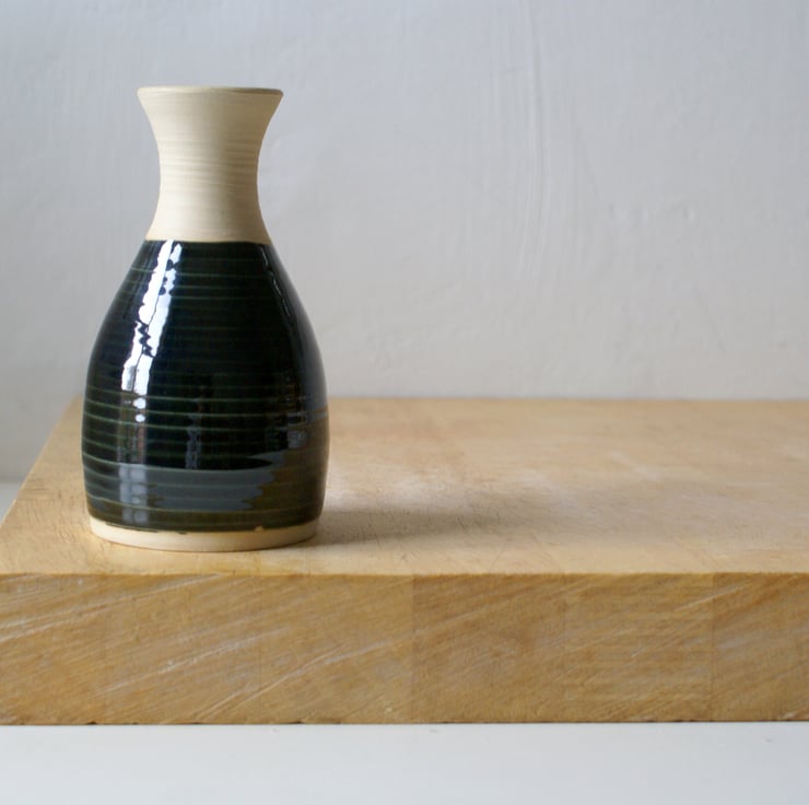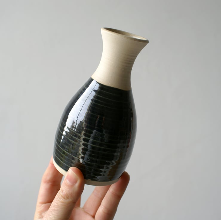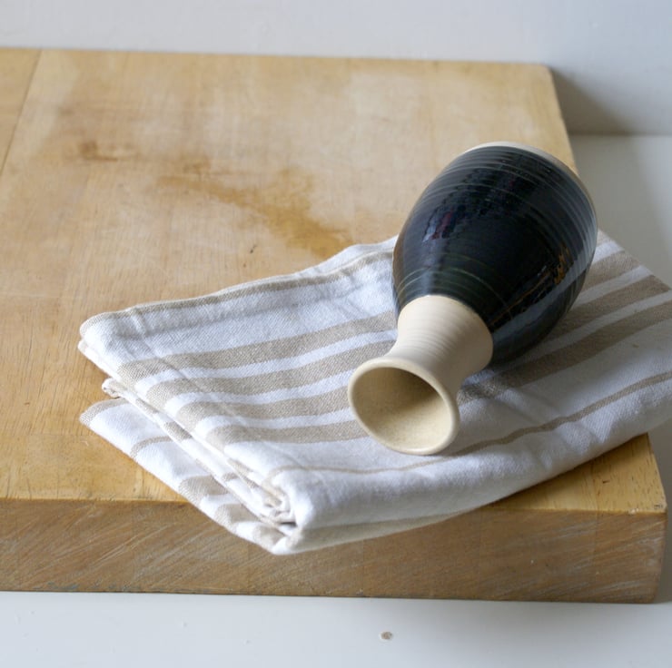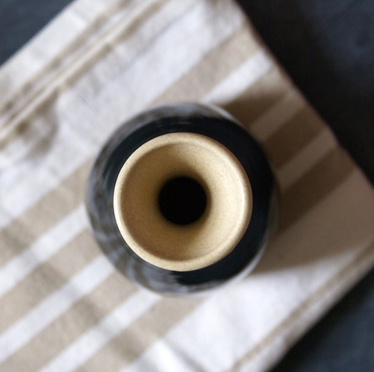 The inside is glazed in a simple brown speckled glaze and the outside a dark glossy black decorates the outside along with an unglazed band at the top for contrast. The piece itself was given a narrow neck by gently collaring it on the wheel while it was being thrown.