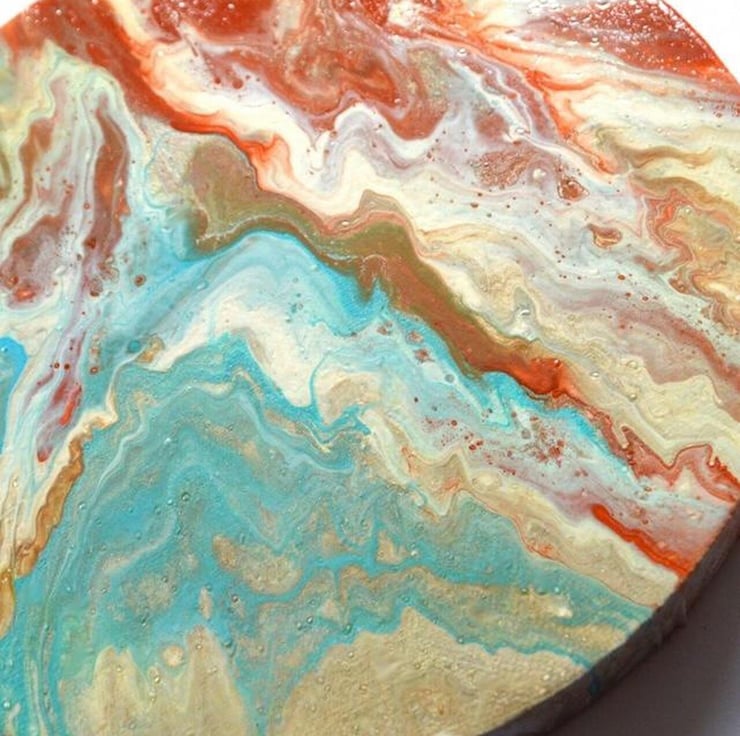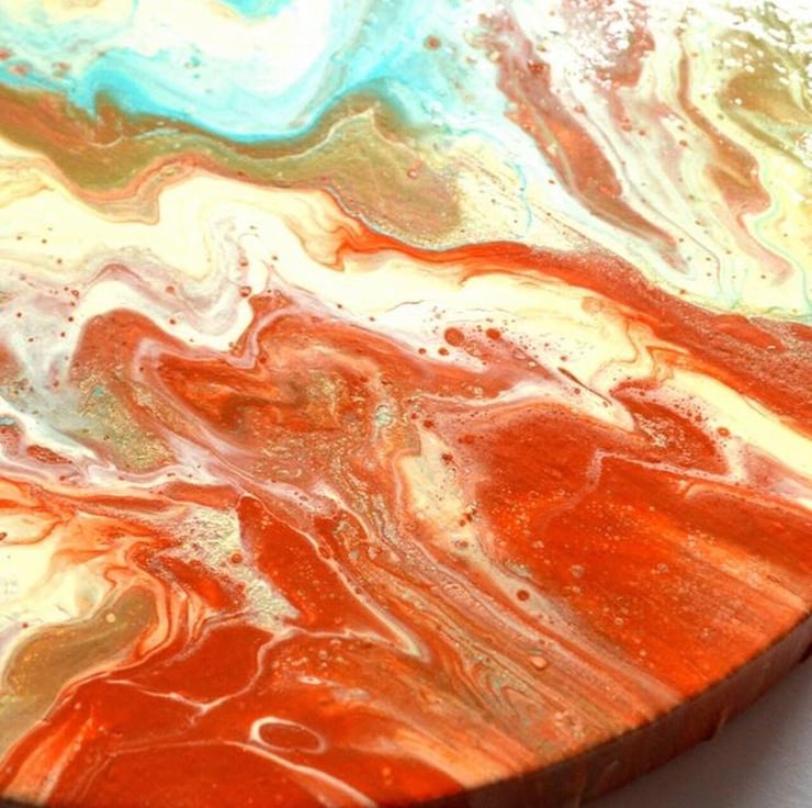 The swirled and blended colours are predominantly shades of pumpkin rust, cream and turquoise with gold and metallic hints, it has a varnish on the top surface only