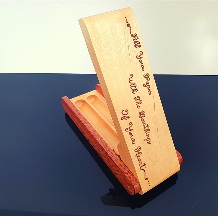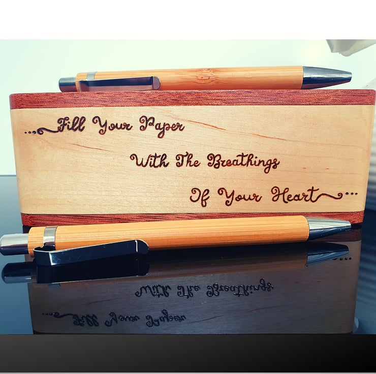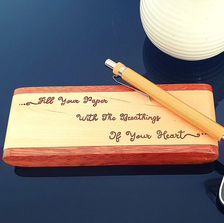 Double pen holder, with the inspirational quote "Fill Your Paper With The Breathings Of Your Heart" (William Wordsworth) hand-burnt on the top of the lid, with the method of Pyrography. A beautiful and practical gift for writers, this desk accessory is also suitable for Father's Day, Mother's Day, Birthdays and many occasions.