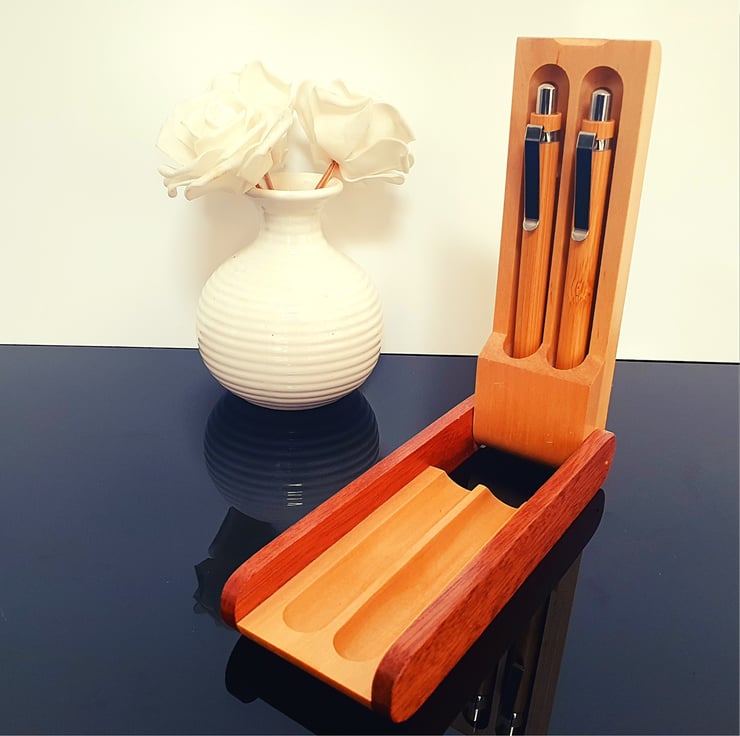 The pen holder lays closed horizontally and it opens vertically to reveal two pen slots that will hold both standard and thicker pens. It is made from rosewood and it comes with two complimentary bamboo pens, that can be refilled when they run out.