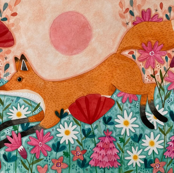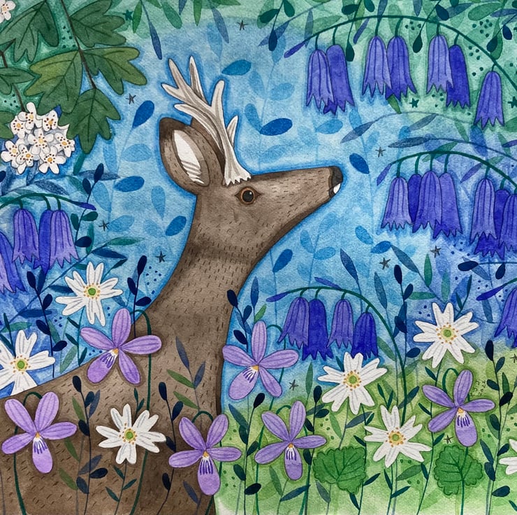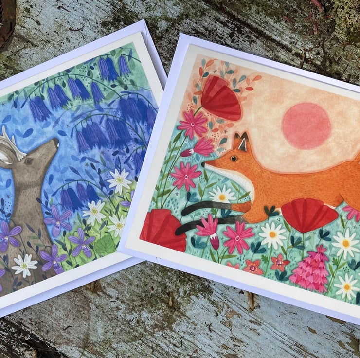 One of the prettiest sights in May is the verges of stitchwort and bluebells, which inspired me to do the deer design. The fox design is inspired by the Solstice and a gorgeous meadow on a hill near me which is full of orchids in June.