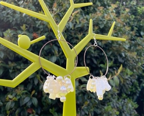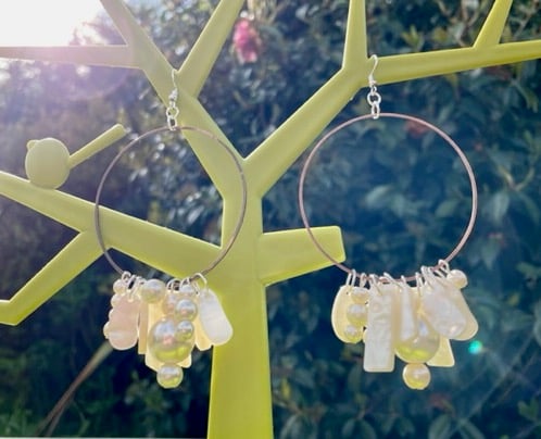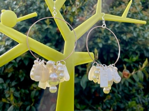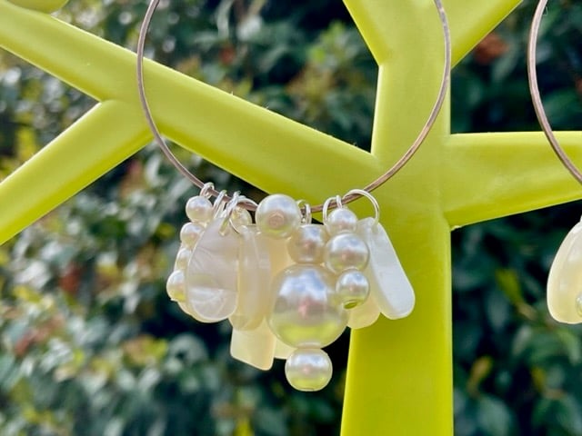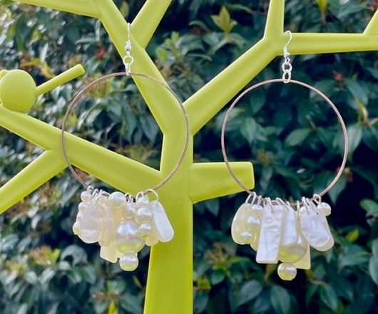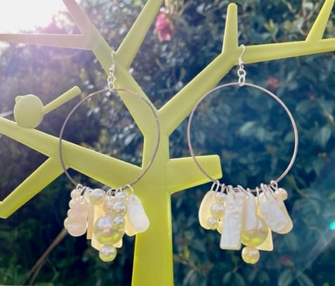 Stunning extra large copper hoops with clusters of glass pearls in different sizes and arrangements and interspersed with these really pretty resin mother of pearl shapes. I've finished off with silver plated hypo allergenic ear wires and silver plated jump rings.