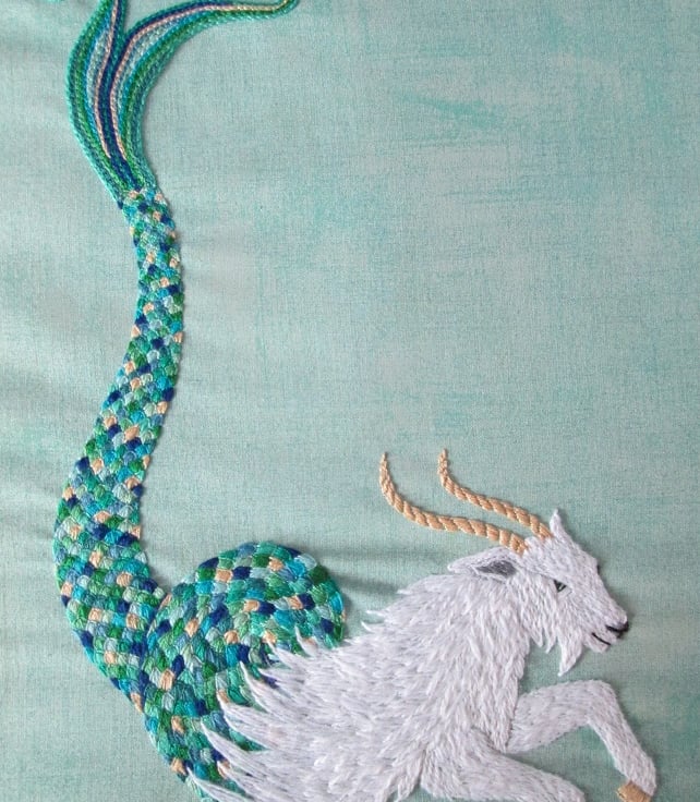 Touching on subjects as diverse as astrology, the 100m Final & the slightly sinister nature of cold fish fingers, the collection rounds off with a haiku advent calendar & my Christmas poems from 2004 to 2012 (which can also be found in my Decorating the Tree pamphlet). And yes, the cover image, was based upon my own illustration, which later became the reference image for my Capricorn embroidery.
