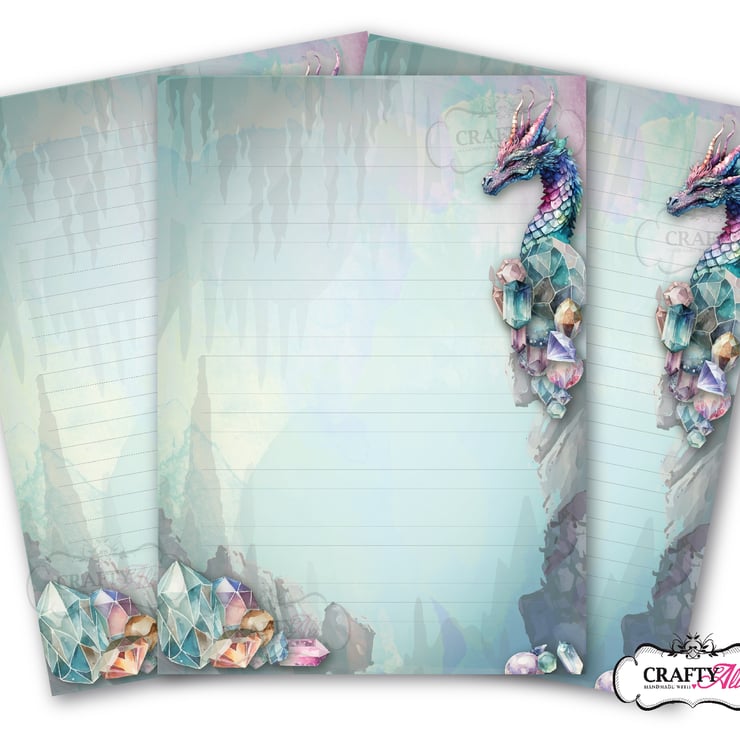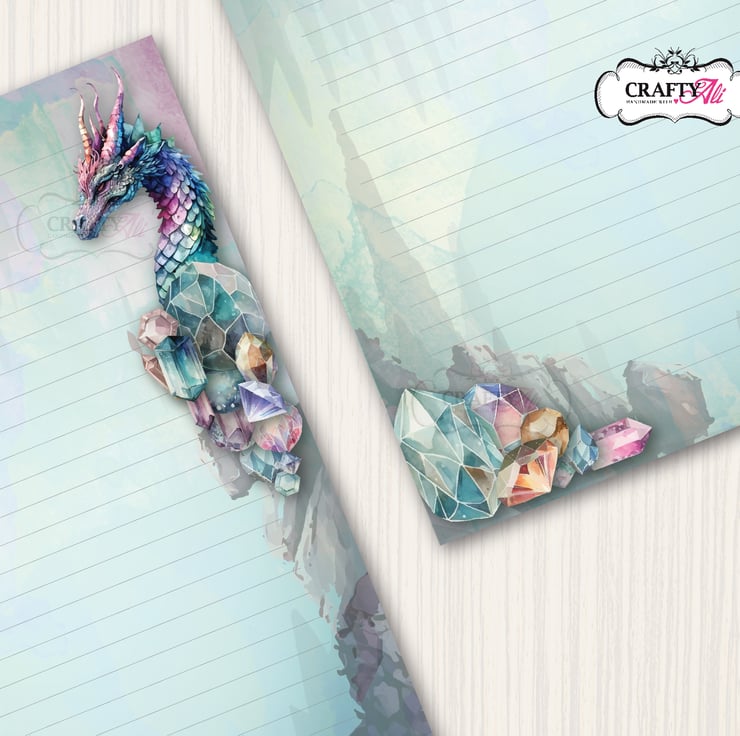 A set of 10 sheets of A5 size handmade letter writing / notepaper set with a design featuring a dragon surrounded by colourful crystals.