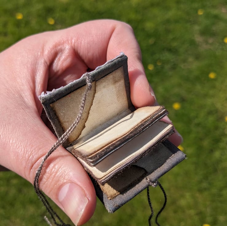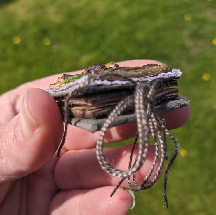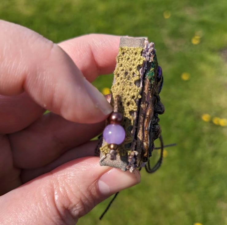 The sculpted part is polymer clay, painted with acrylics and sealed with a gloss varnish. There are tiny purple beetles in the detail.