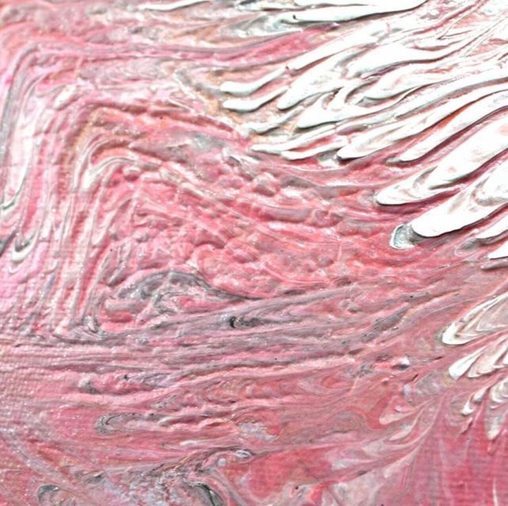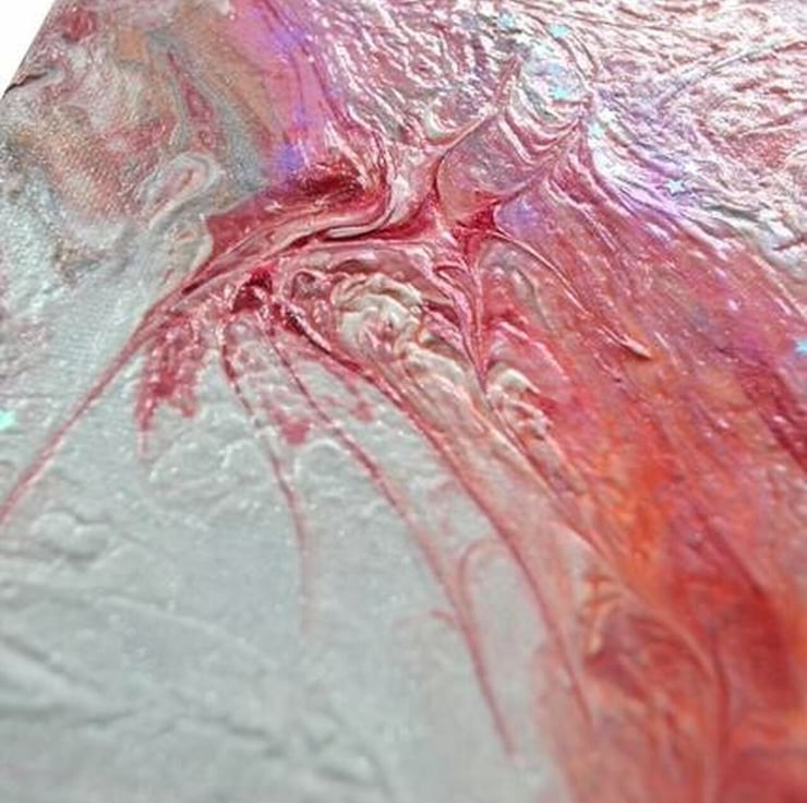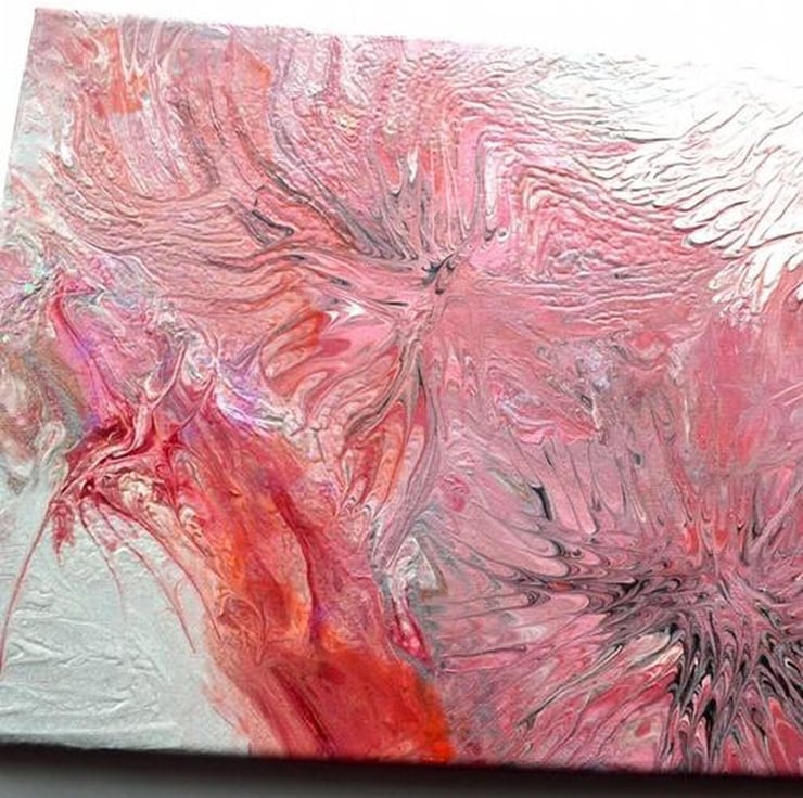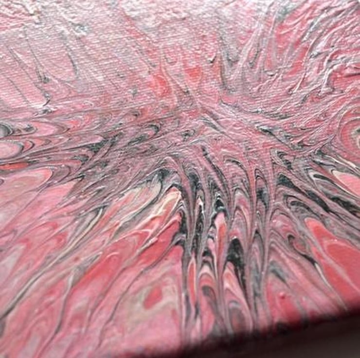The swirled and blended colours are predominantly shades of red and pink with black, white and silver.