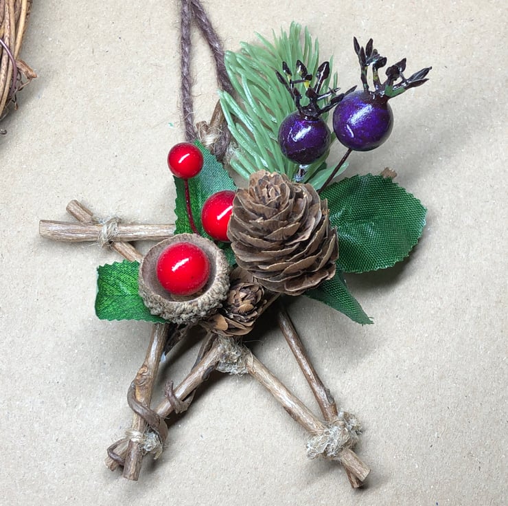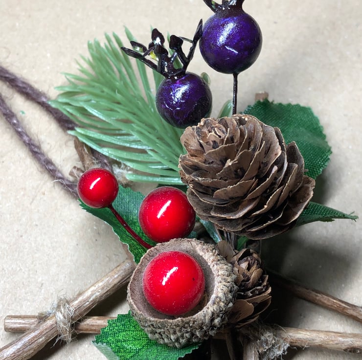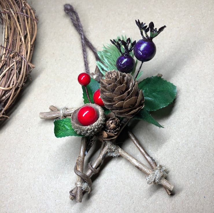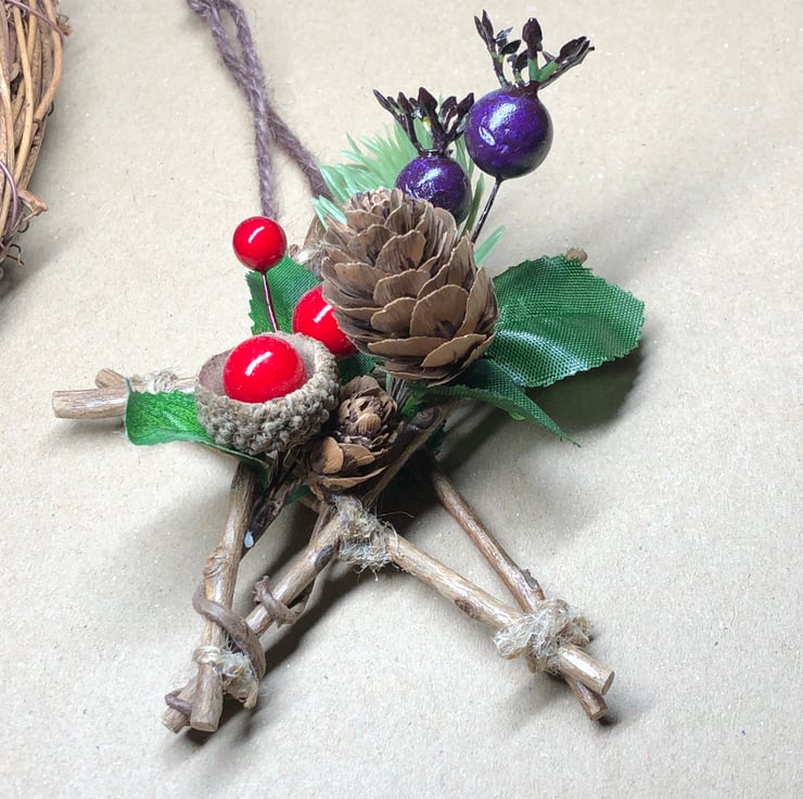 These are individually made with 4 inch woodland sticks, assorted bells, berries, acorn parts, string and cones they can be hung anywhere or leaned against bookstacks, vases or lamps to add a rustic detail.