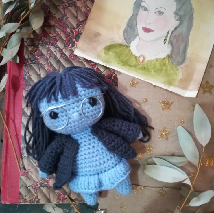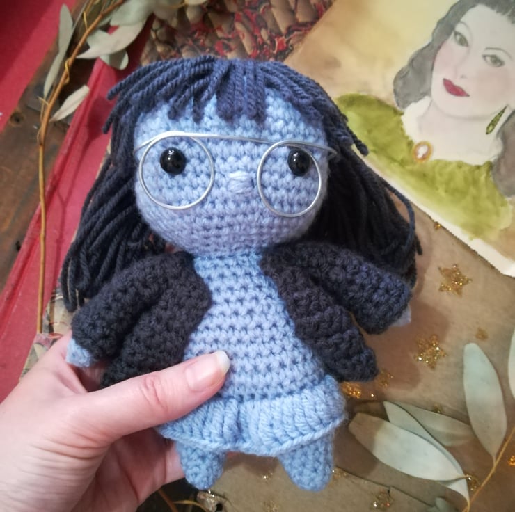 This pretty crochet Moaning Myrtle doll is inspired by the magical ghost. She has handmade wire glasses.