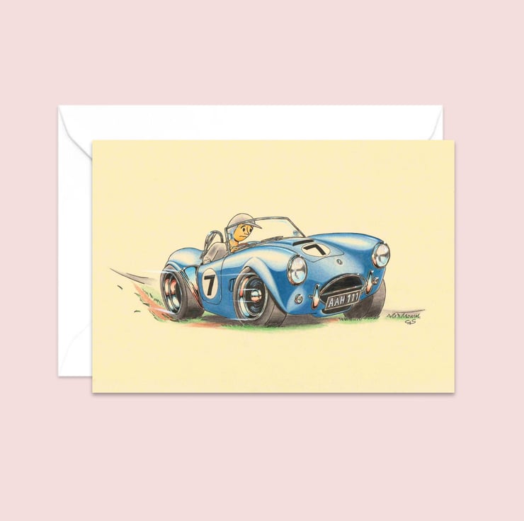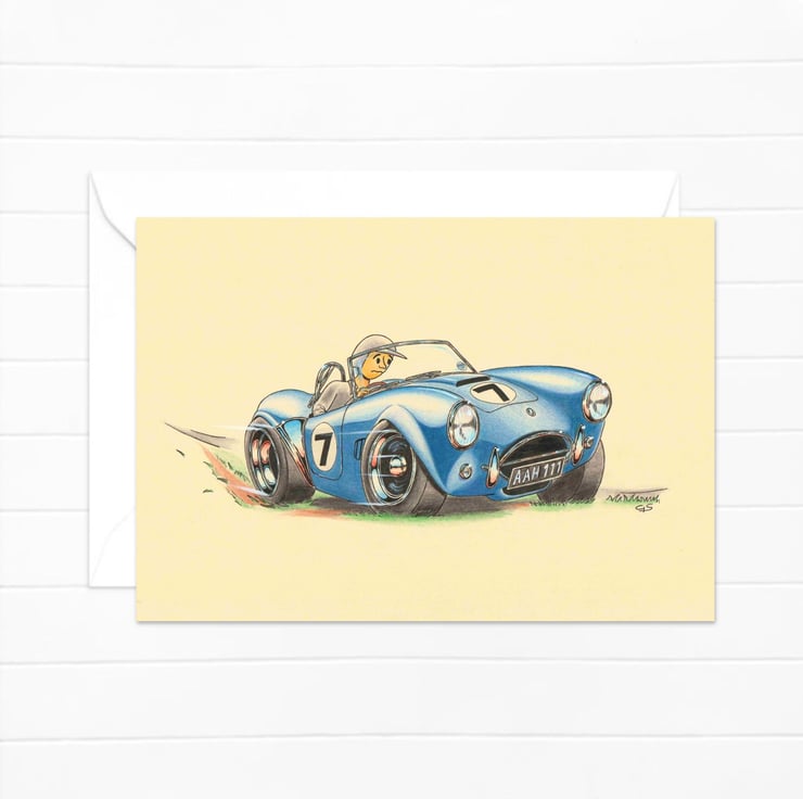 An original art greeting card, featuring a hand-drawn pencil illustration for classic car buffs and boy racers!