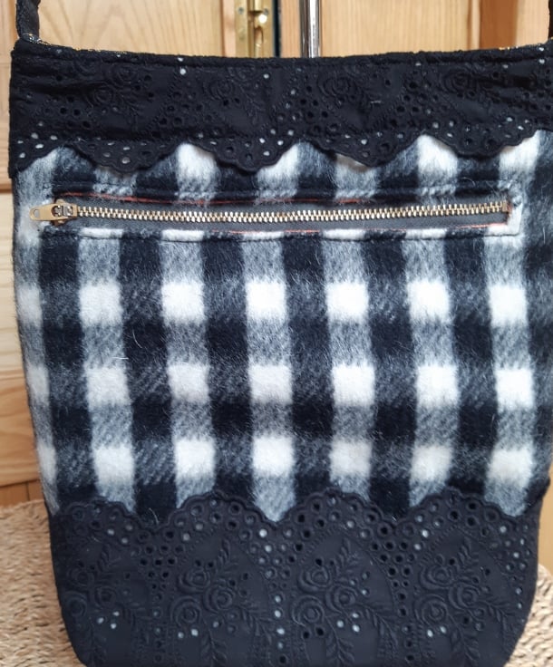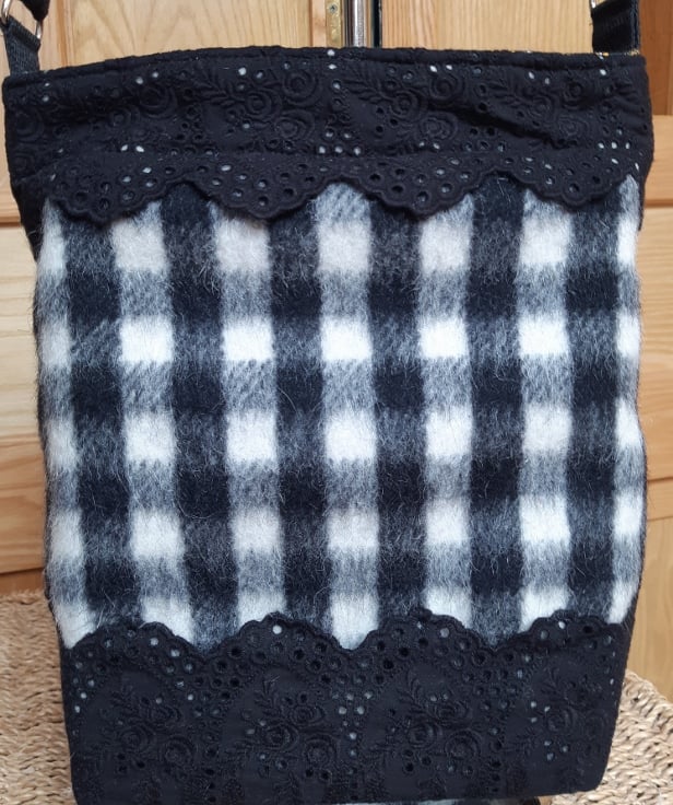 Fluffy and soft black and white checked wool bag, featuring black broderie-anglais trim. Zipped back pocket, printed twill lining, inner pocket, magnetic fastener and adjustable cotton webbing straps.