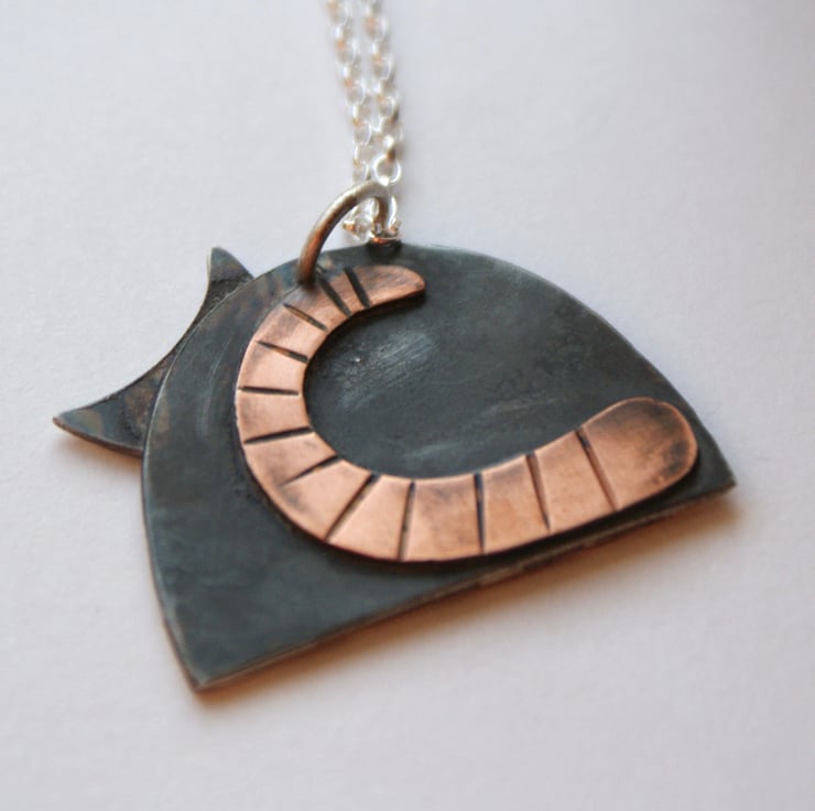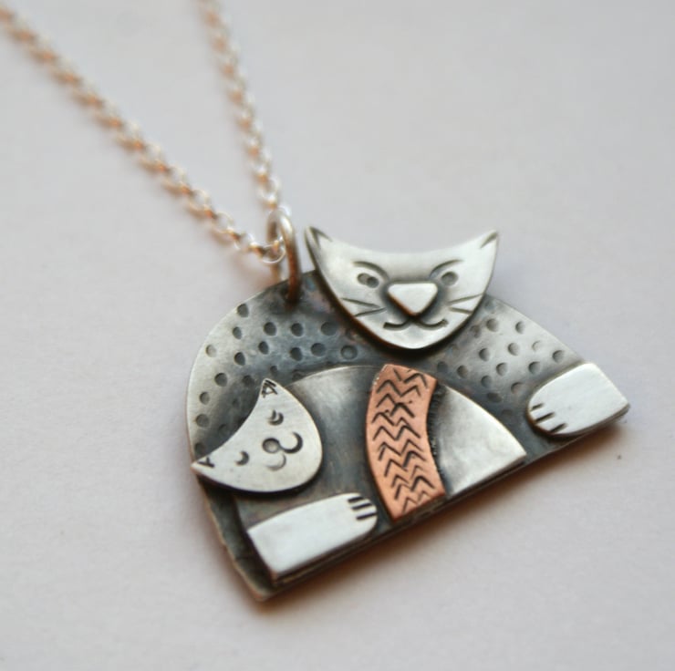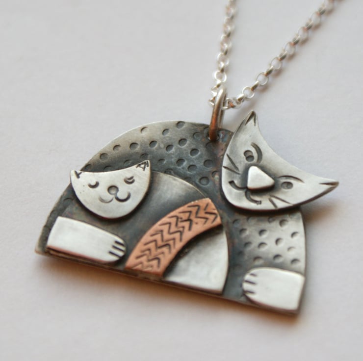 Made to order. A quirky necklace featuring a stylised cat and kitten hand cut from layers of silver and copper. The pieces have been cut and textured before being soldered together, oxidised and partly polished back to a satin finish. There is a copper tail on the reverse.