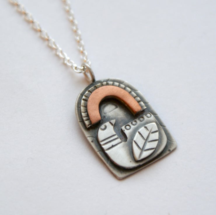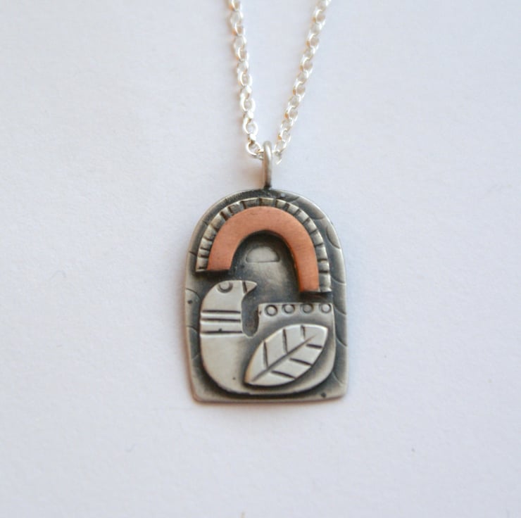 A cute necklace featuring a stylised bird and a rainbow hand cut from layers of silver and copper. The pieces have been cut and textured before being soldered together, oxidised and partly polished back to a satin finish.