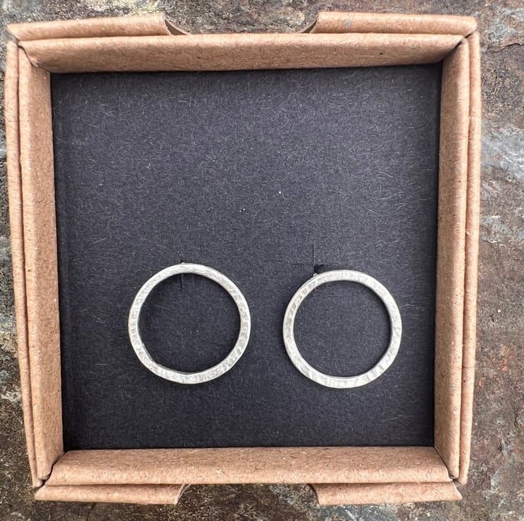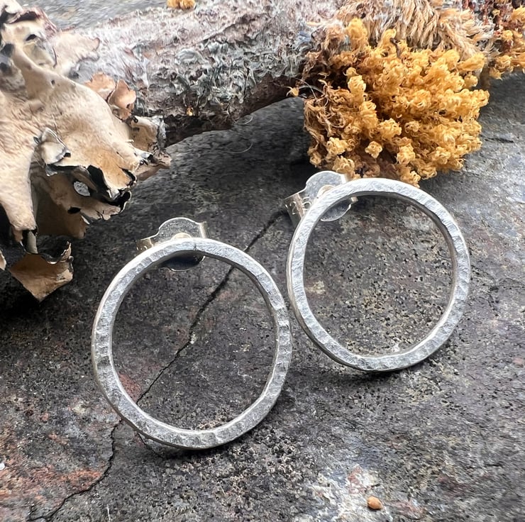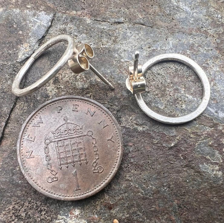 The earrings measure about 15mm/just over half an inch in diameter. The earposts and scroll backs are sterling silver. All silver is from an eco source .