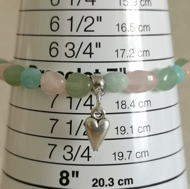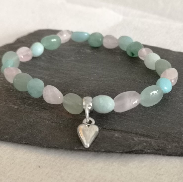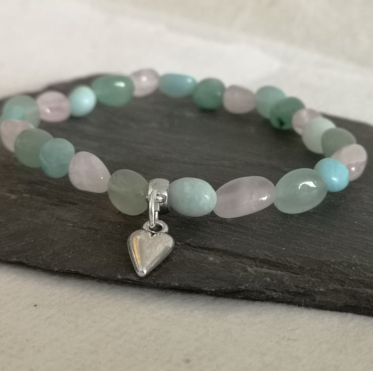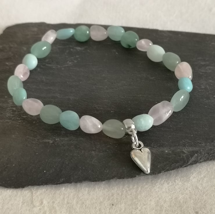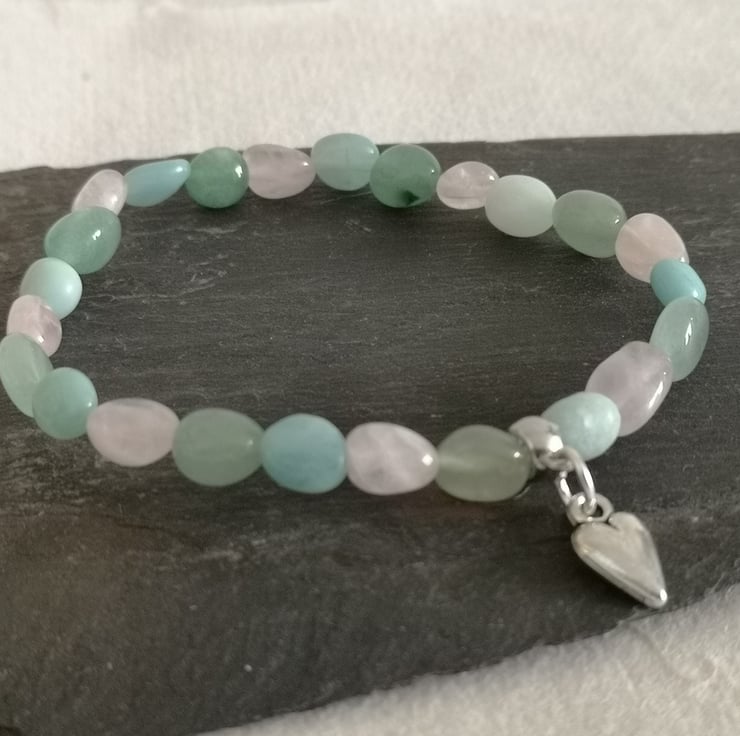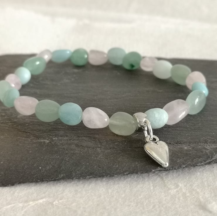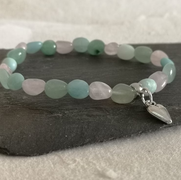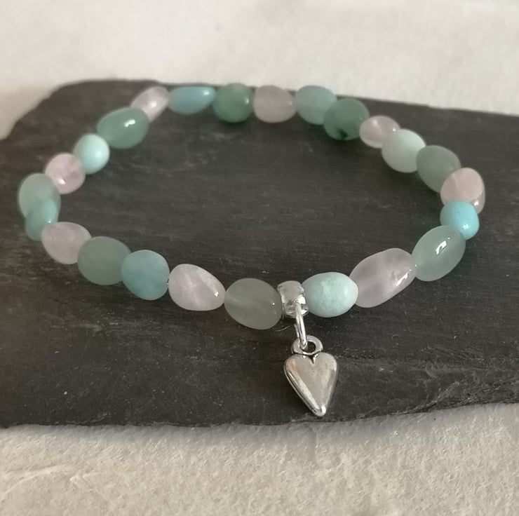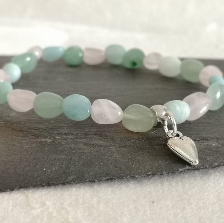 This beautiful heart chakra bracelet features three different types of gemstones that are believed to support and balance the heart chakra. The gemstones are rose quartz, green aventurine, and amazonite.