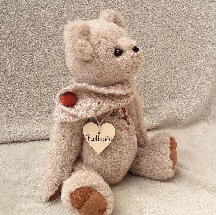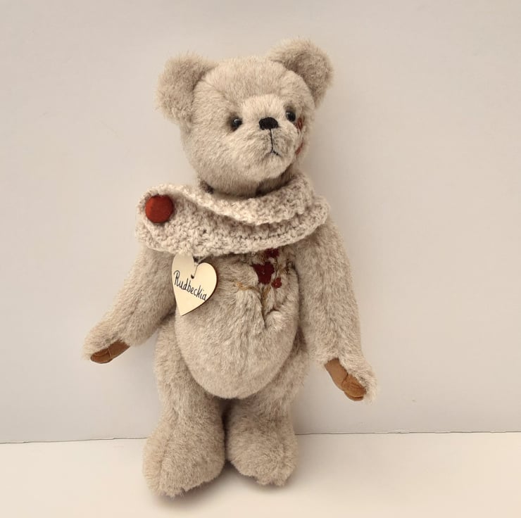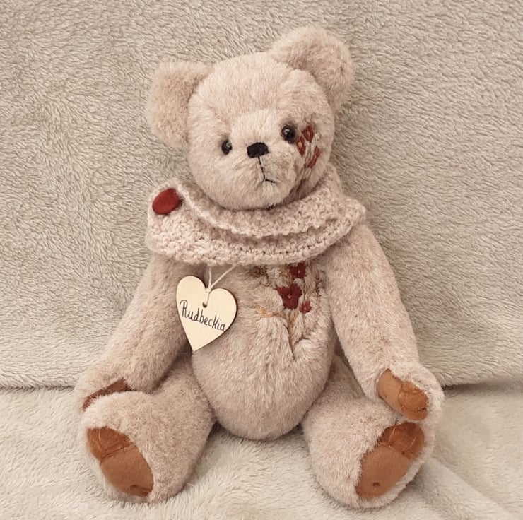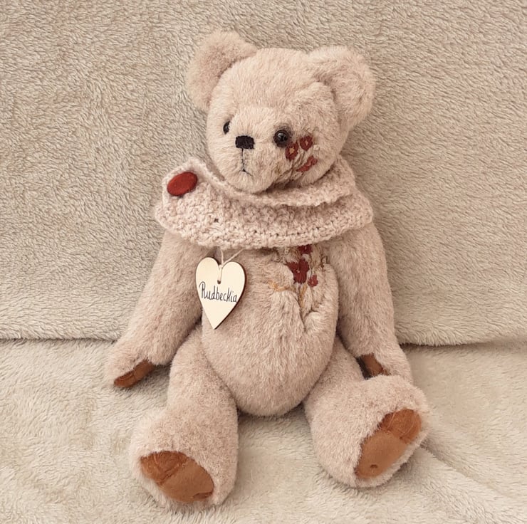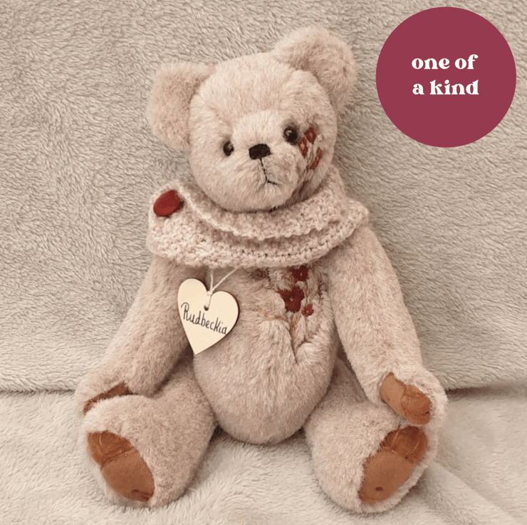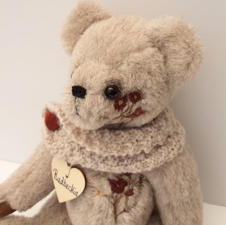 Rudbeckia is a luxury heirloom bear, designed as a one off keepsake for the adult collector, she is traditionally styled and would make a beautiful gift for someone special or a lovely addition for the bear collector. She has been created with great care and attention to detail and is part of my new collection of bears with embroidery directly onto their fur.