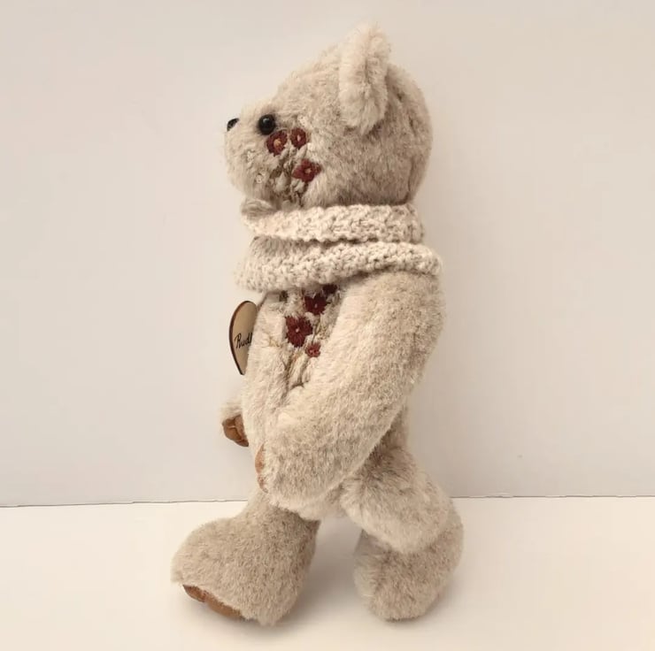 Rudbeckia named after the mahogany red perennial flowers, a luxury bear with hand embroidered flower details to her body front and face in rich russets.