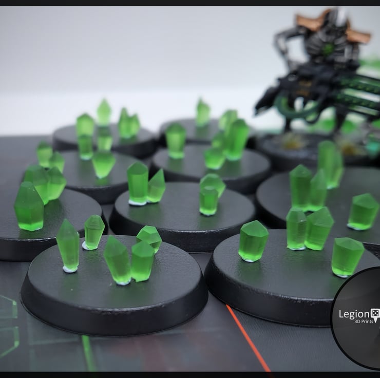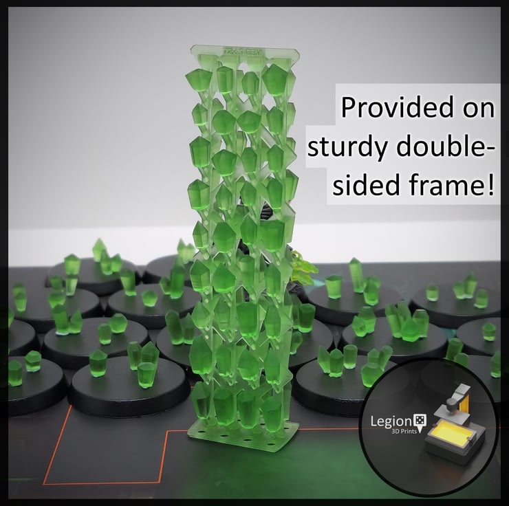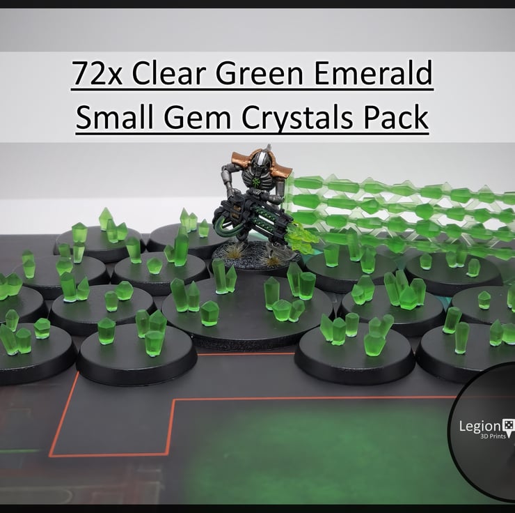 Add some sparkle to your miniatures with this 3d printed set of 72x Clear Green Emerald Small Gem Crystals for decorating bases and terrain.