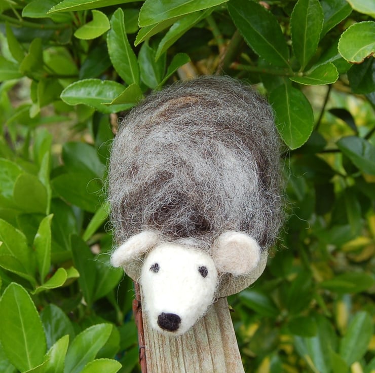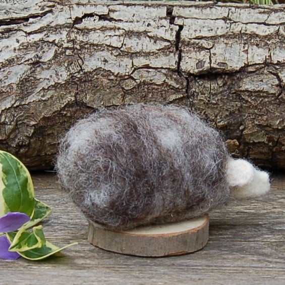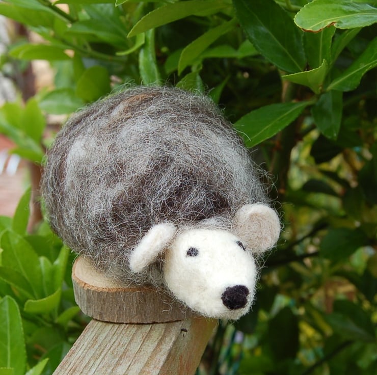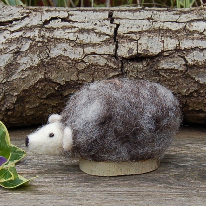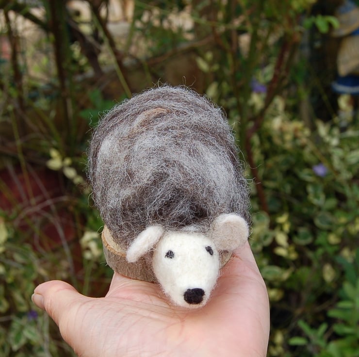 The face and internal body of the hedgehog have made using the needlefelt method to create a solid centre and shaped face. Beads make cute little eyes. The hedgehogs spines and soft squishy undyed Jacobs fleece from British sheep lightly needle felted to keep its shape. No spiky spines on this hedgehog!