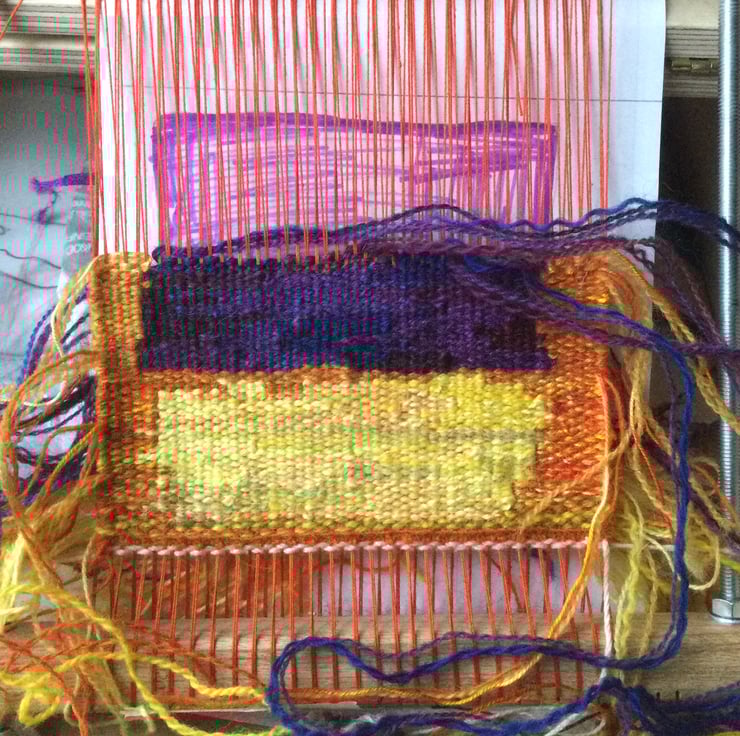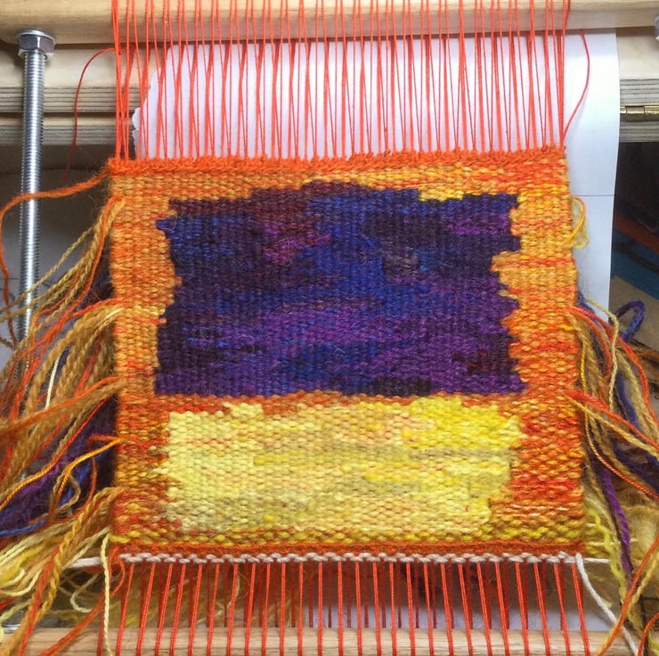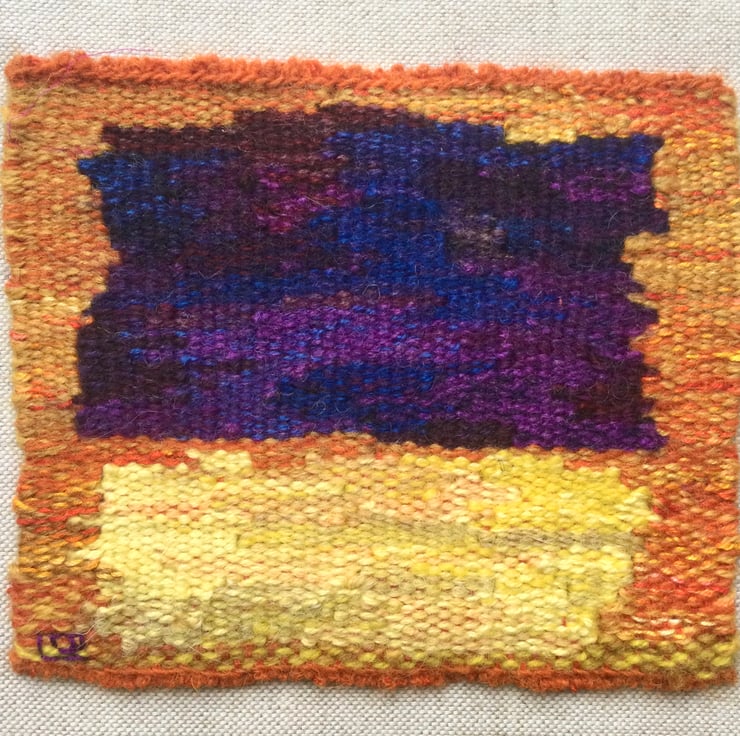 Homage to Rothko is a small, one of a kind, unframed tapestry weaving, handwoven with a mixture of wools and cotton yarns. I have used an orange cotton warp, and the weft is various shades of yellow, ochre, orange, purple, burgundy and blue. I combined bundles of yarns in the different hues to make subtle colour changes and although this is a small weaving, it took many hours to weave because of the number of colour changes. It is stitched onto a piece of linen mix fabric which measures approx 21 x 21cm and is ready for framing in a standard frame, readily available online.