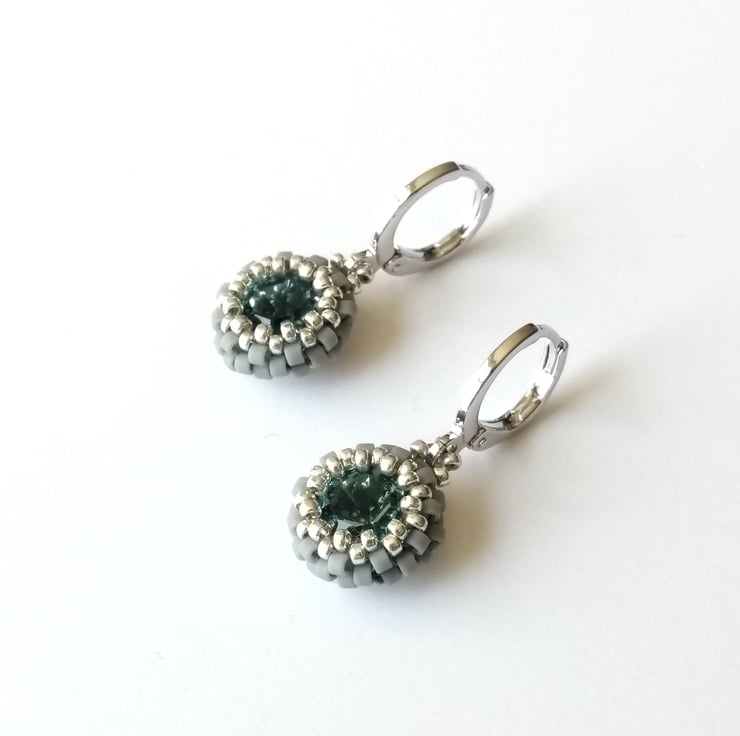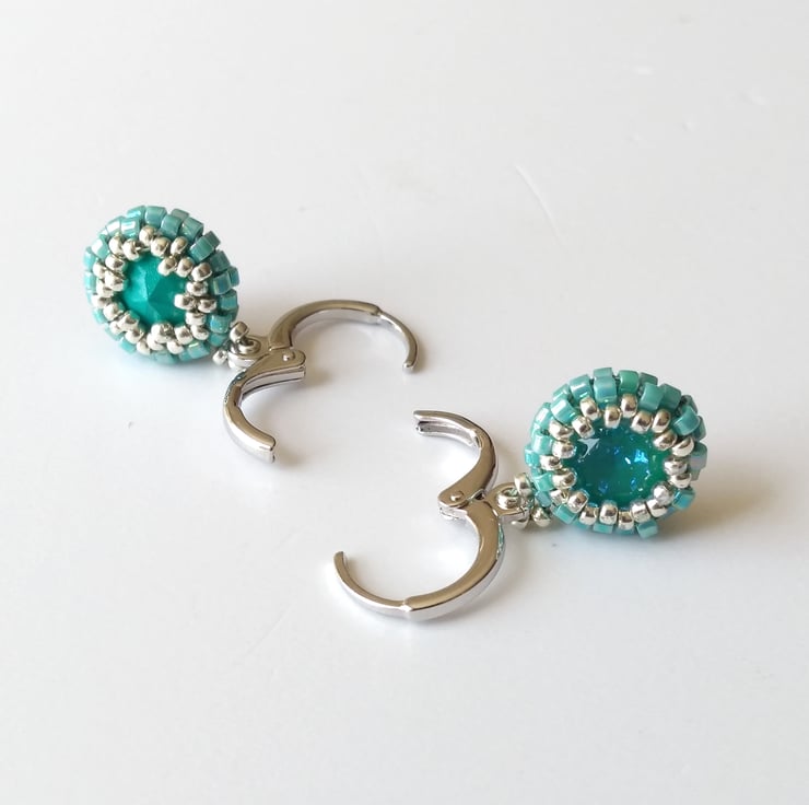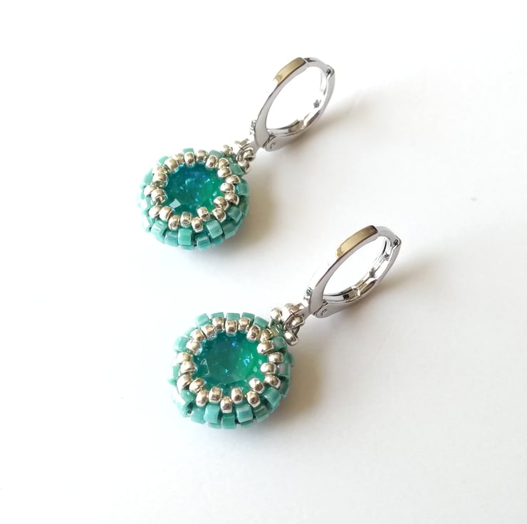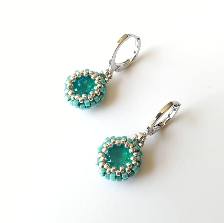 This dainty pair features a beautiful Austrian-made 8mm chaton (the centre) in Laguna Delite - a lovely opaque turquoise green - encased turquoise and silver seed beads. The drops have been strung directly on to a platinum-plated lever back round earrings, making them nice and secure. The lever backs are hinged for easy-open, easy-close - see photo. Also available in raspberry pink and dove grey, see separate listings.