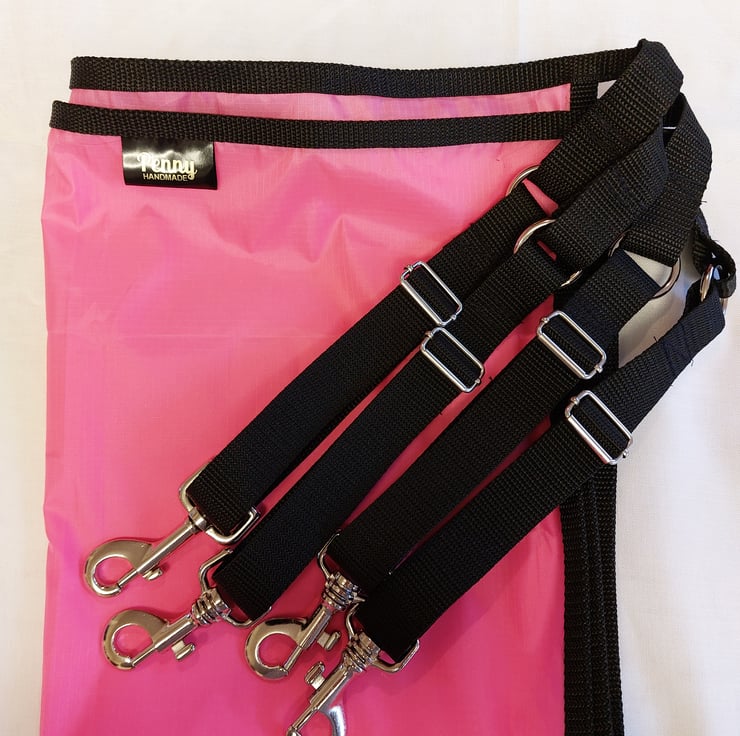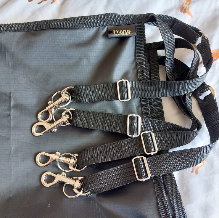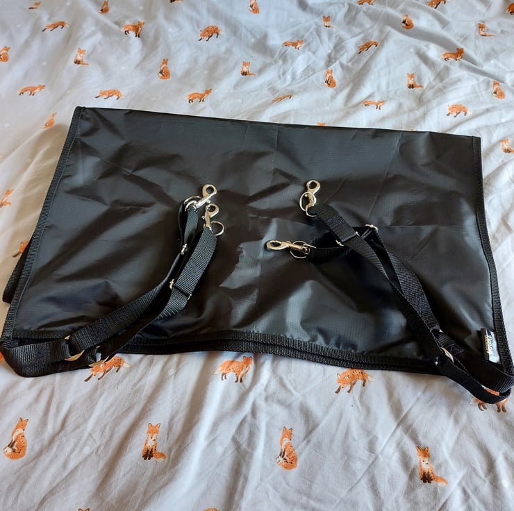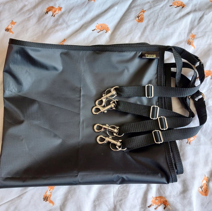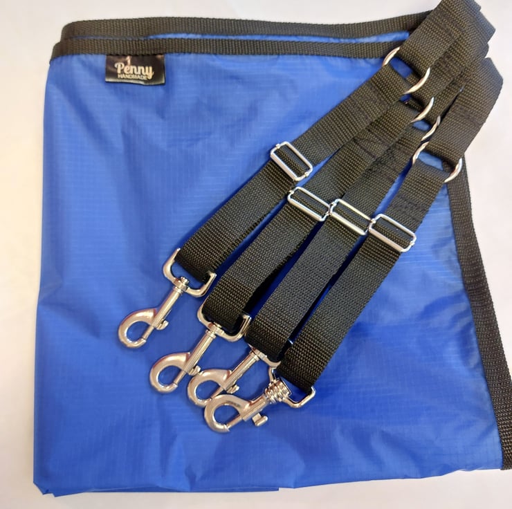 Stable guard measuring 150cm x 60cm. Handmade using a waterproof ripstop fabric. Lightweight and strong ripstop does exactly as is described. if it should get a hole it will not tear further, as would other fabrics. Polypropylene webbing straps are adjustable with trigger hooks and sliders in chrome. Items can be made to order in any size, other colours are available. Stable guards can be made to order using your own measurements. Please note, items made to order will take longer to despatch, I will have a turn around of about 7 days from sourcing your fabric to completion. Any questions regarding this item please feel free to contact me. If you want it shorter, wider, taller please ask.