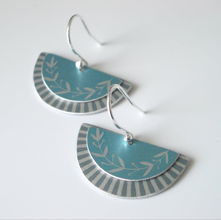 These fan shaped earrings are made from aluminium which I have dyed in grey and blue and printed with a silver wreath of leaves pattern. The dye is made permanent through heat and becomes part of the surface of the metal. I have saw pierced the two separate semi circles by hand and hung them on a sterling silver ear hook.