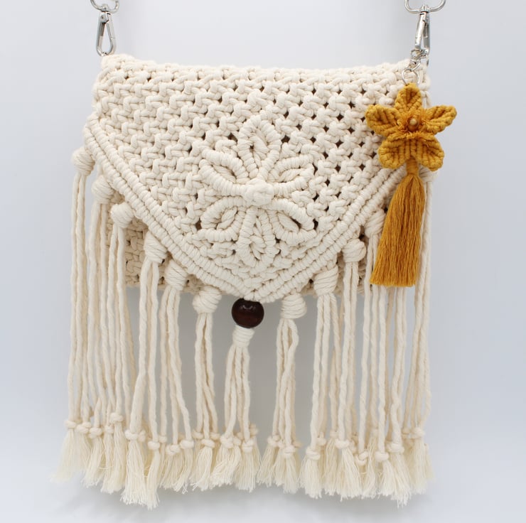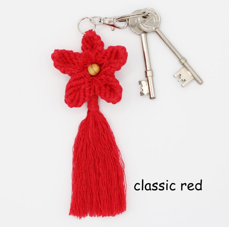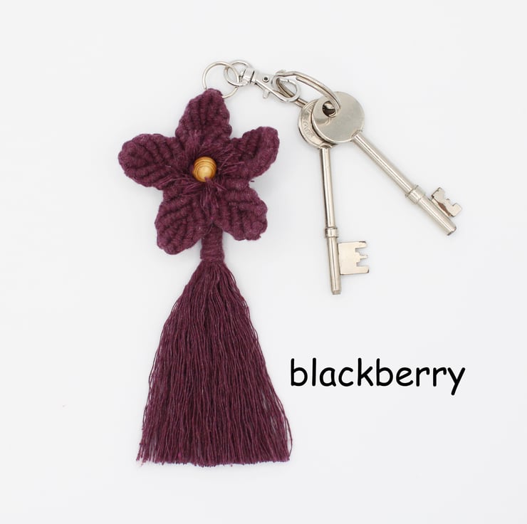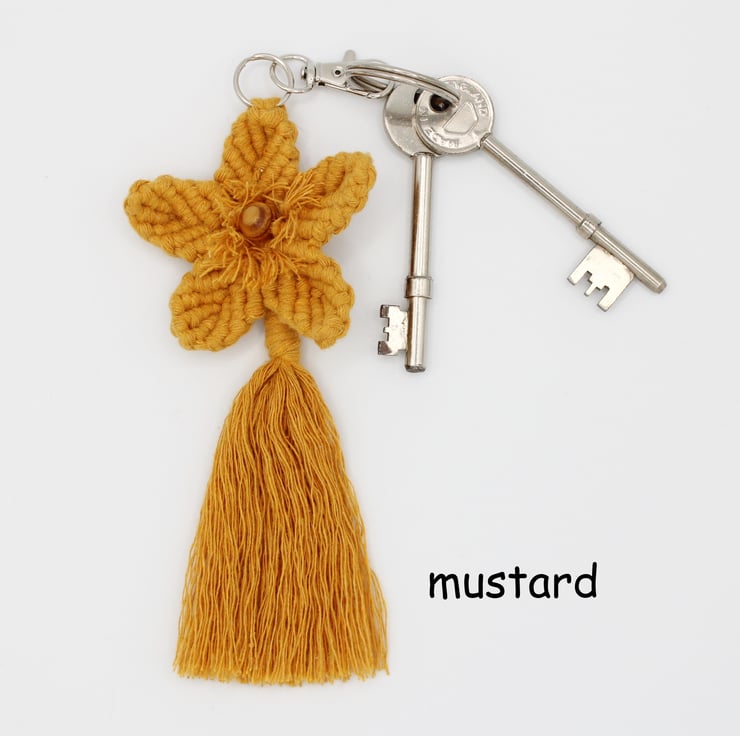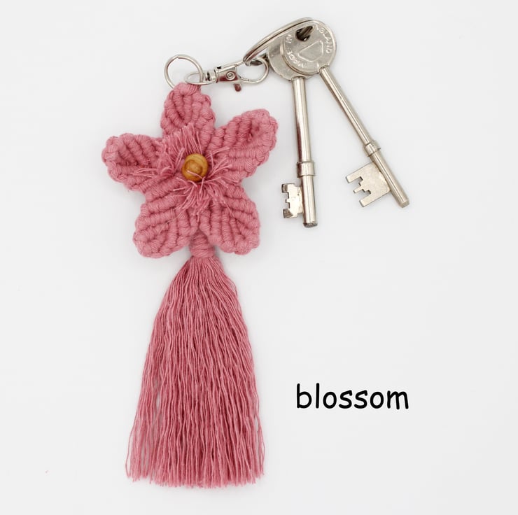 Cute little boho macrame flowers that have been made into tasselled keyrings.