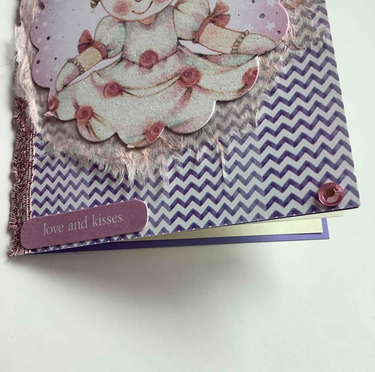 A patterned zig zag paper is in pinks and purples with a pink braid down the folded edge.