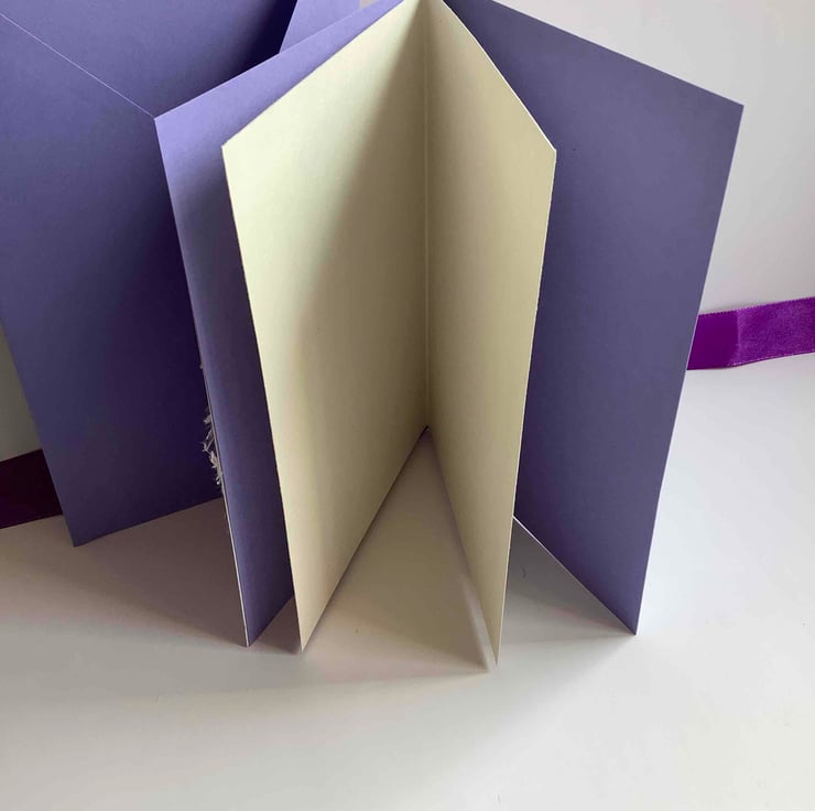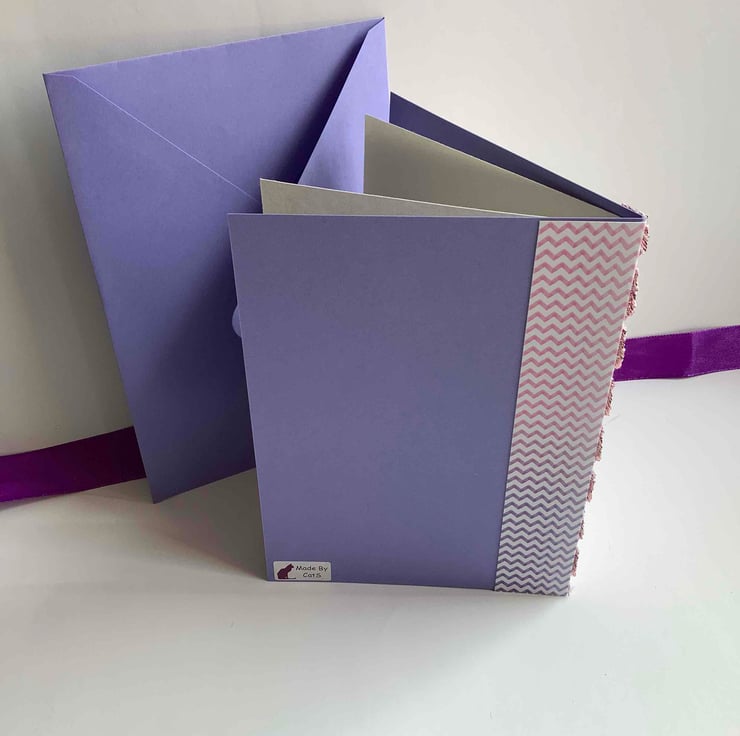 This pretty purple birthday card is decorated in purples and pinks with an ivory insert inside and a purple envelope. On the back is a little purple cat with Made by Cats.