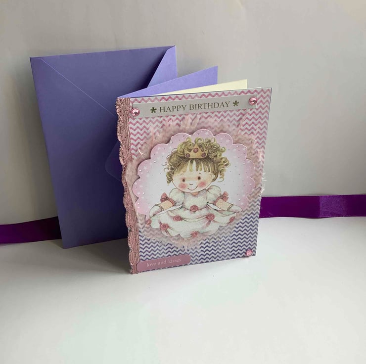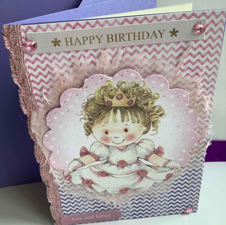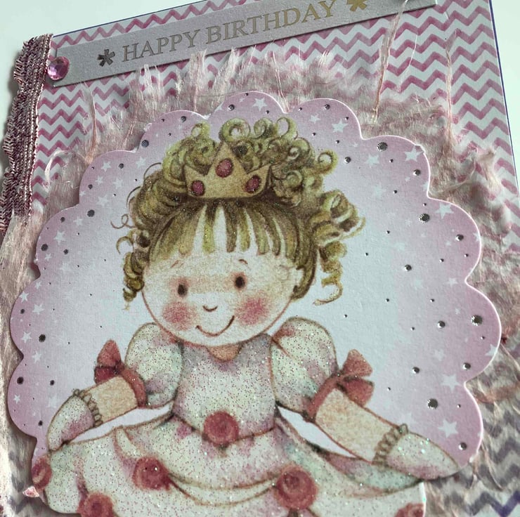 A picture of a little girl princess is centre sitting on some pale pink handmade paper.