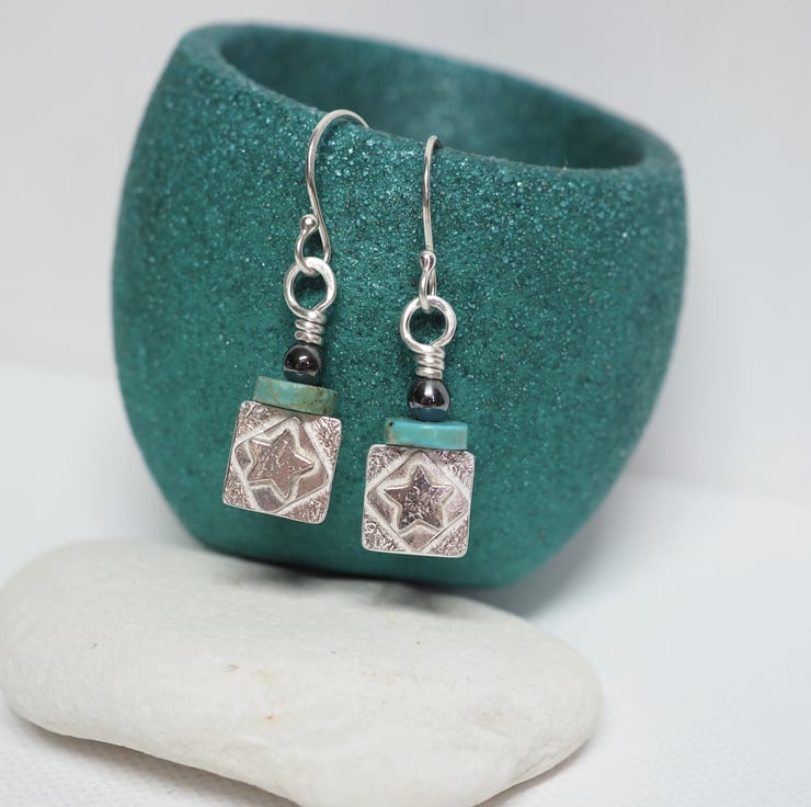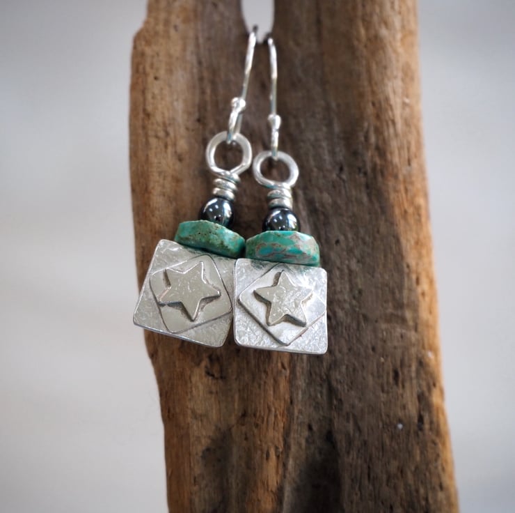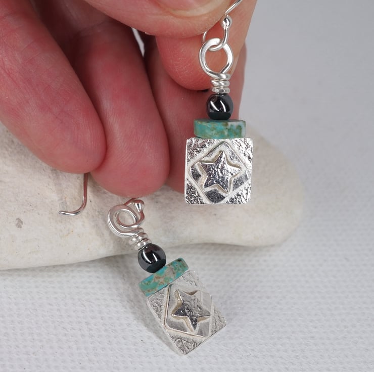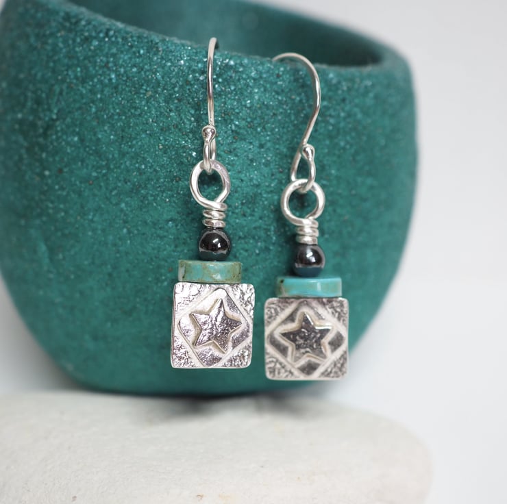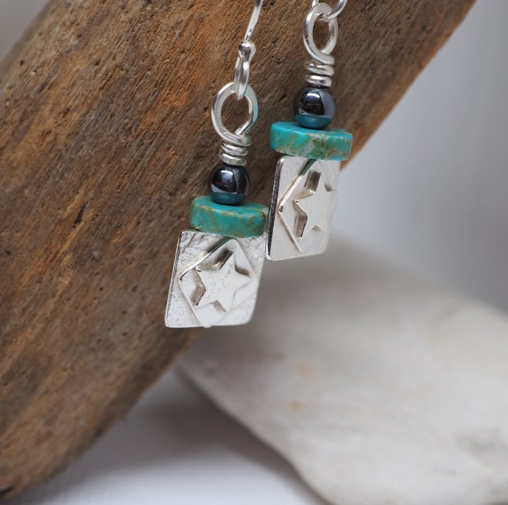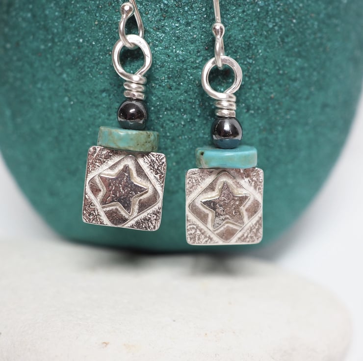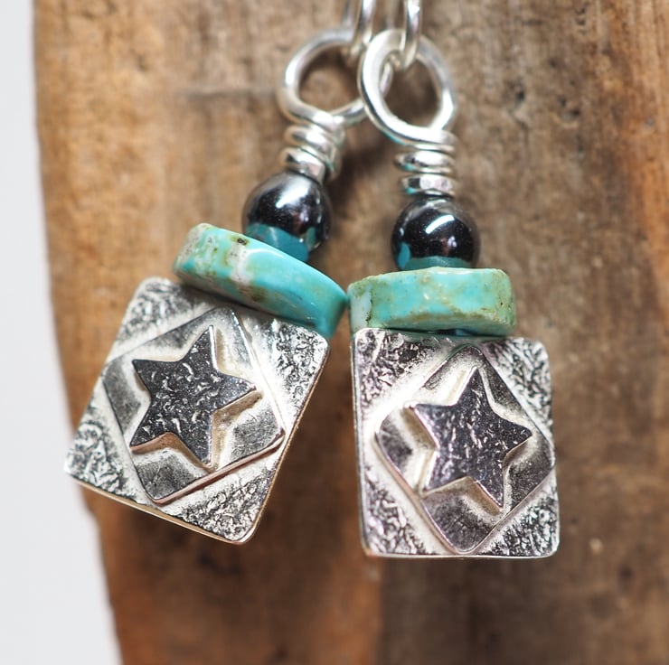 These earrings are completely handmade from quality sterling and argentium silver. They feature a little star fused onto two hammered silver squares. These have been topped with a turquoise disc bead and a round hematite bead. The earrings are finished with a twist of silver and a loop at the top. They hang from handmade Argentium silver 940 ear wires.
