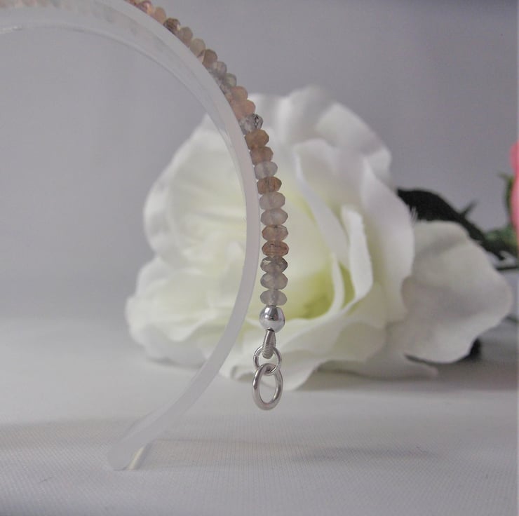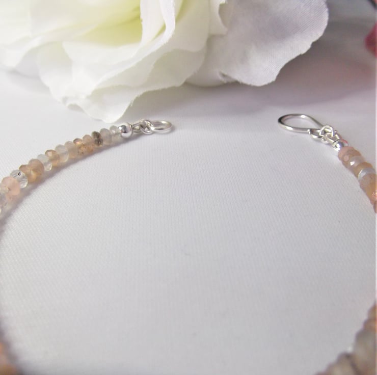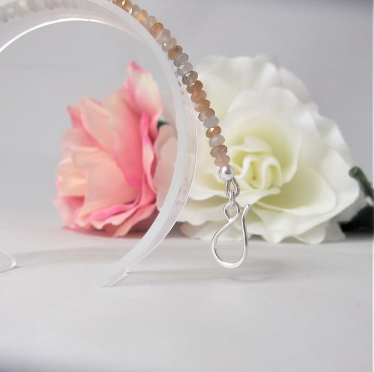 This handmade delicate gemstone bracelet has been made using Moonstone faceted rondelle beads, beading wire and a sterling silver clasp.