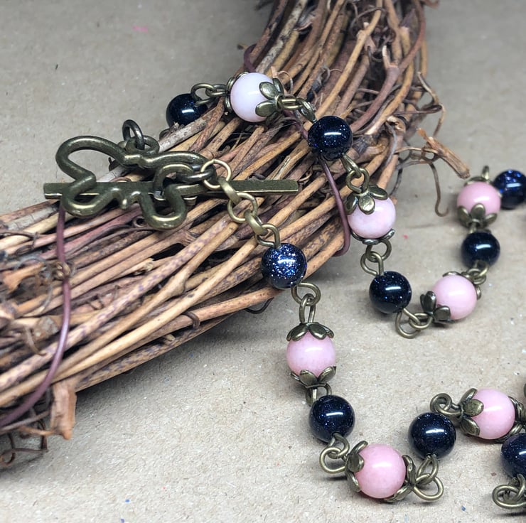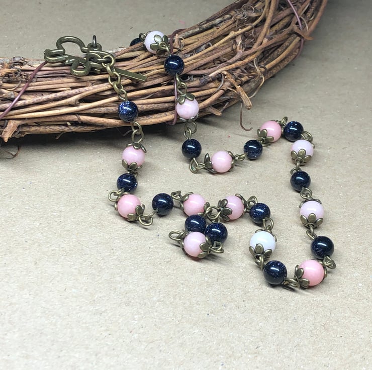 Exclusively created, this choker showcases sparkling navy blue Goldstone beads wit’s delicate coral pink Morganite beads. The unique butterfly toggle and bail eliminates the need to conceal clasps at the nape. A length of 41cm adds to its charm.